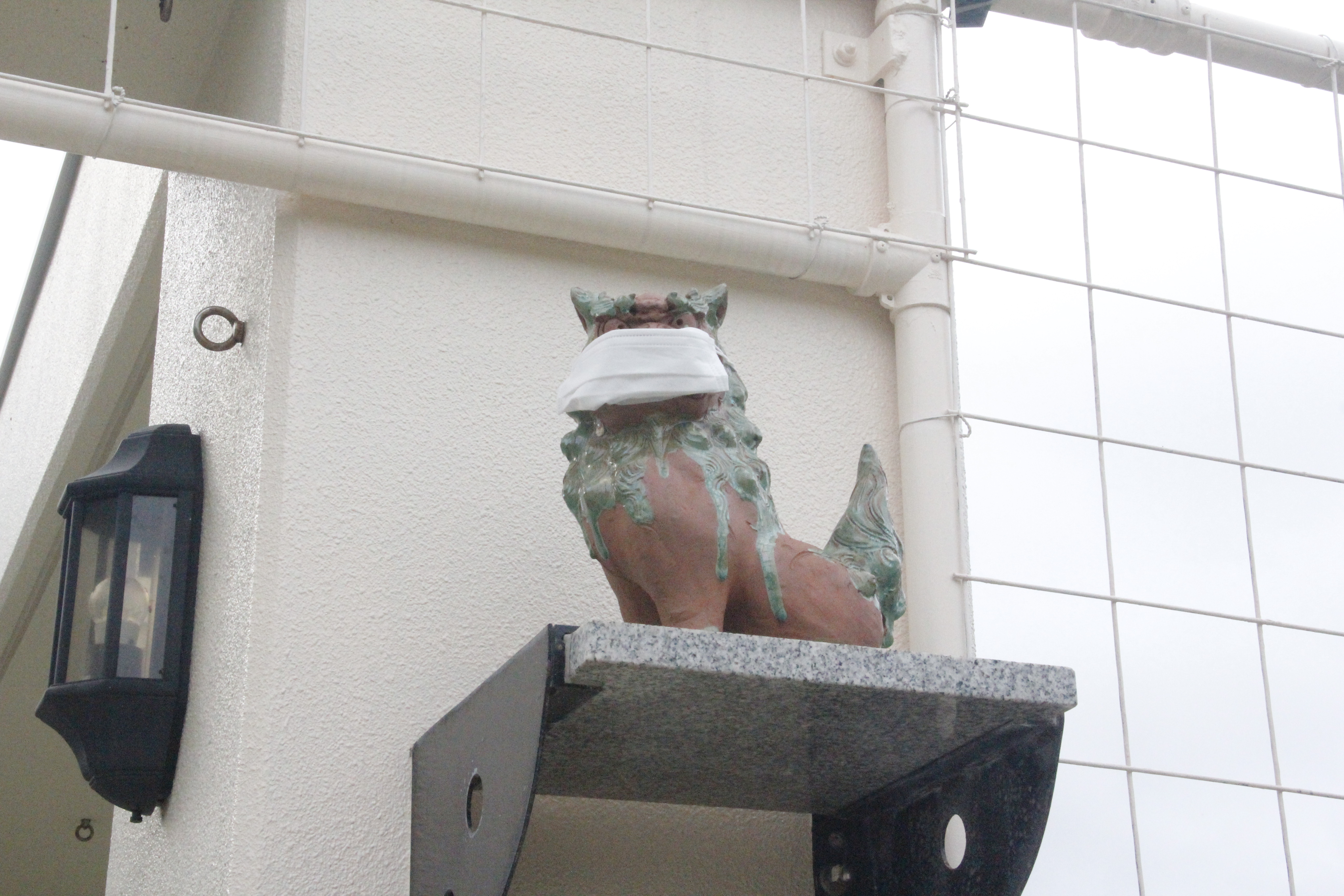 沖縄の守り神「シーサー」もマスクを付けて皆さんをお出迎え!