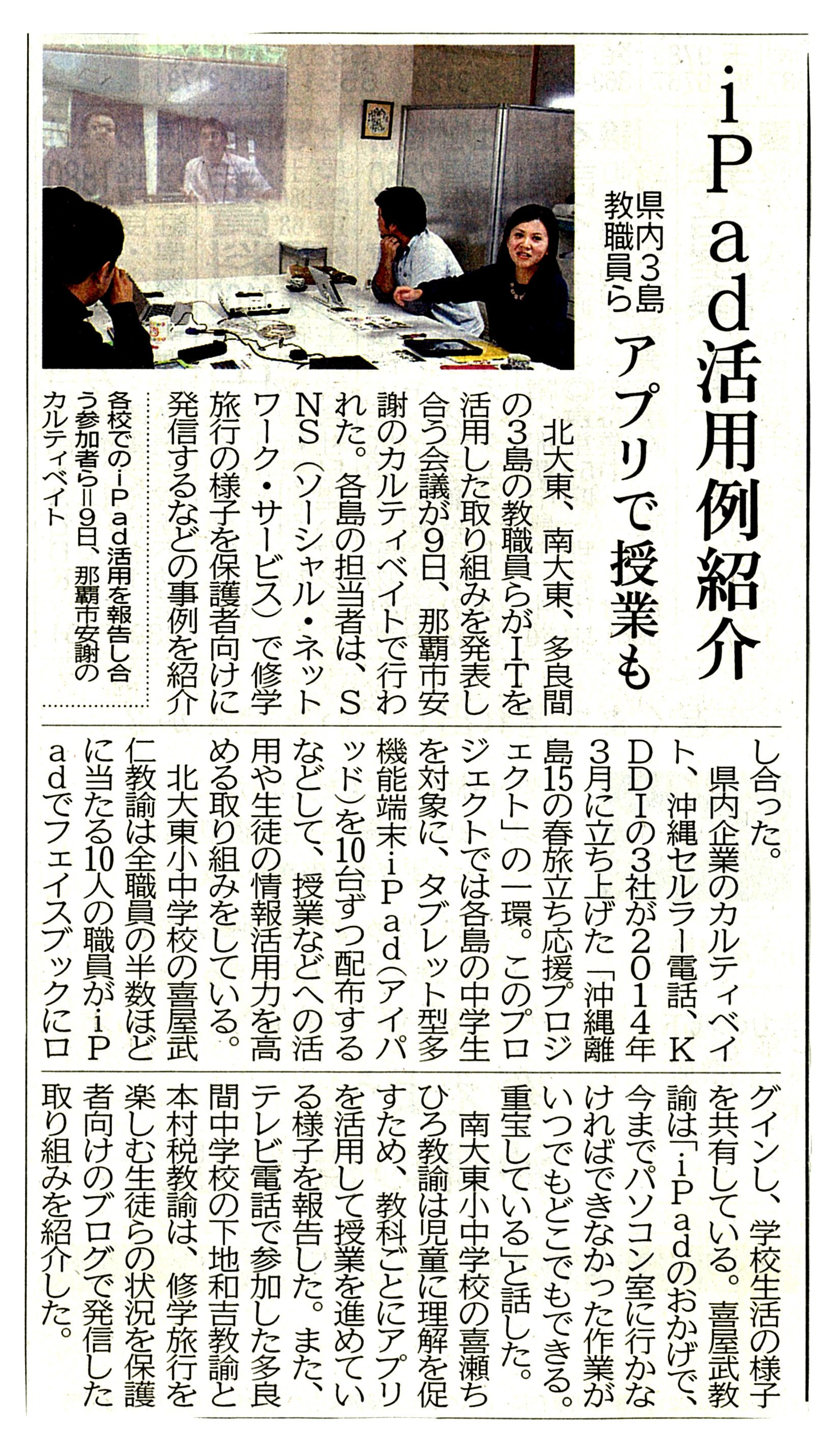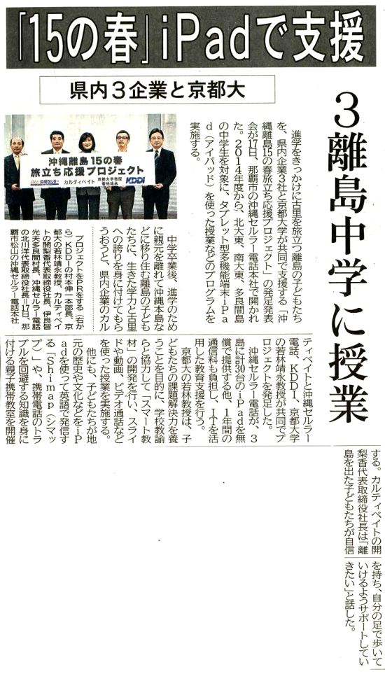 2014年3月18日(火) ITで離島教育支援 多良間島など “15の春”応援P発足(宮古新報)