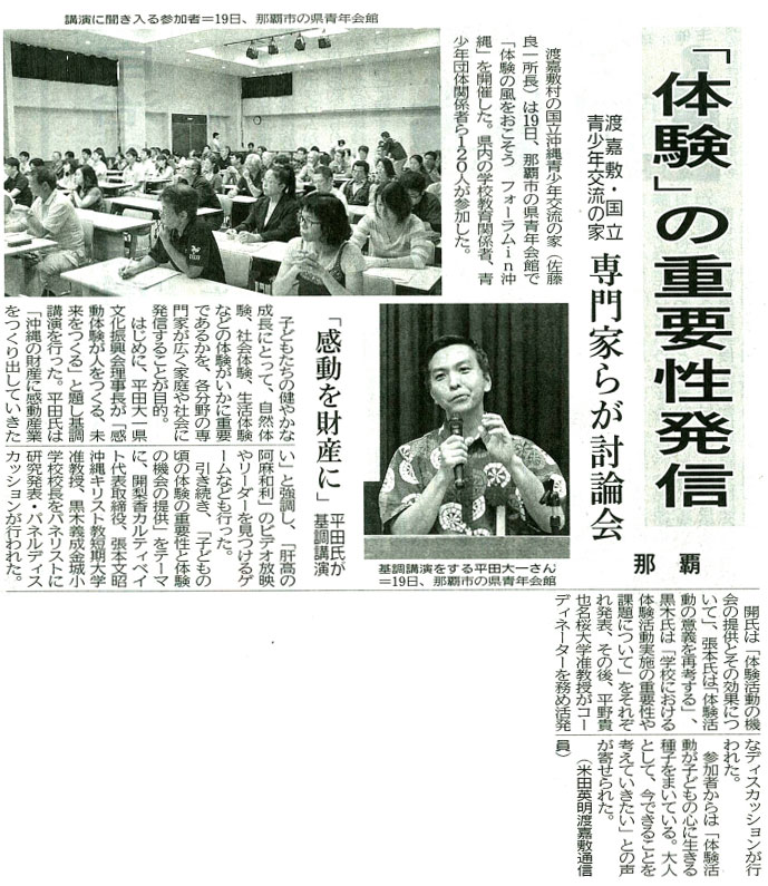 琉球新報 「体験の風をおこそうフォーラムin沖縄」「体験」の重要性発信
