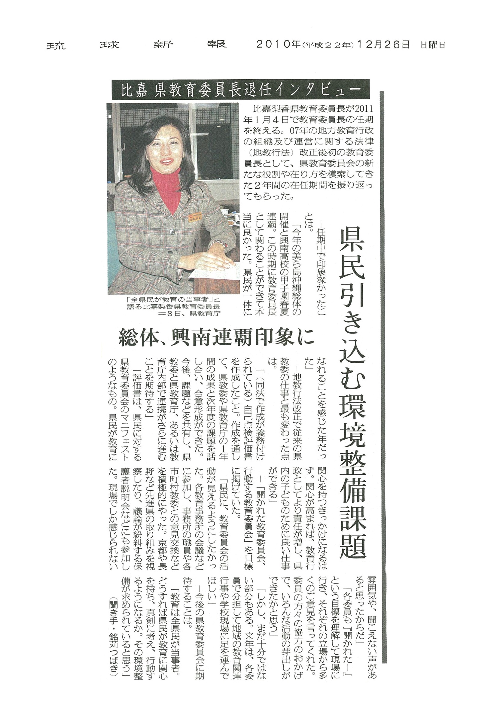 2010.12.26 琉球新報 沖縄県教育委員長退任インタビュー 2010年12月26日 琉球新報に沖縄県教育委員長退任インタビュー「県民引き込む環境整備課題」が掲載されました。 media_20101226