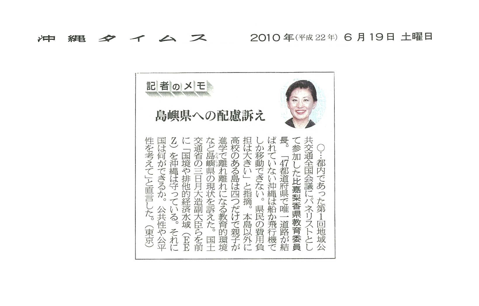2010年6月19日沖縄タイムス 第1回地域公共交通全国会議での弊社代表開の発言が掲載されました。