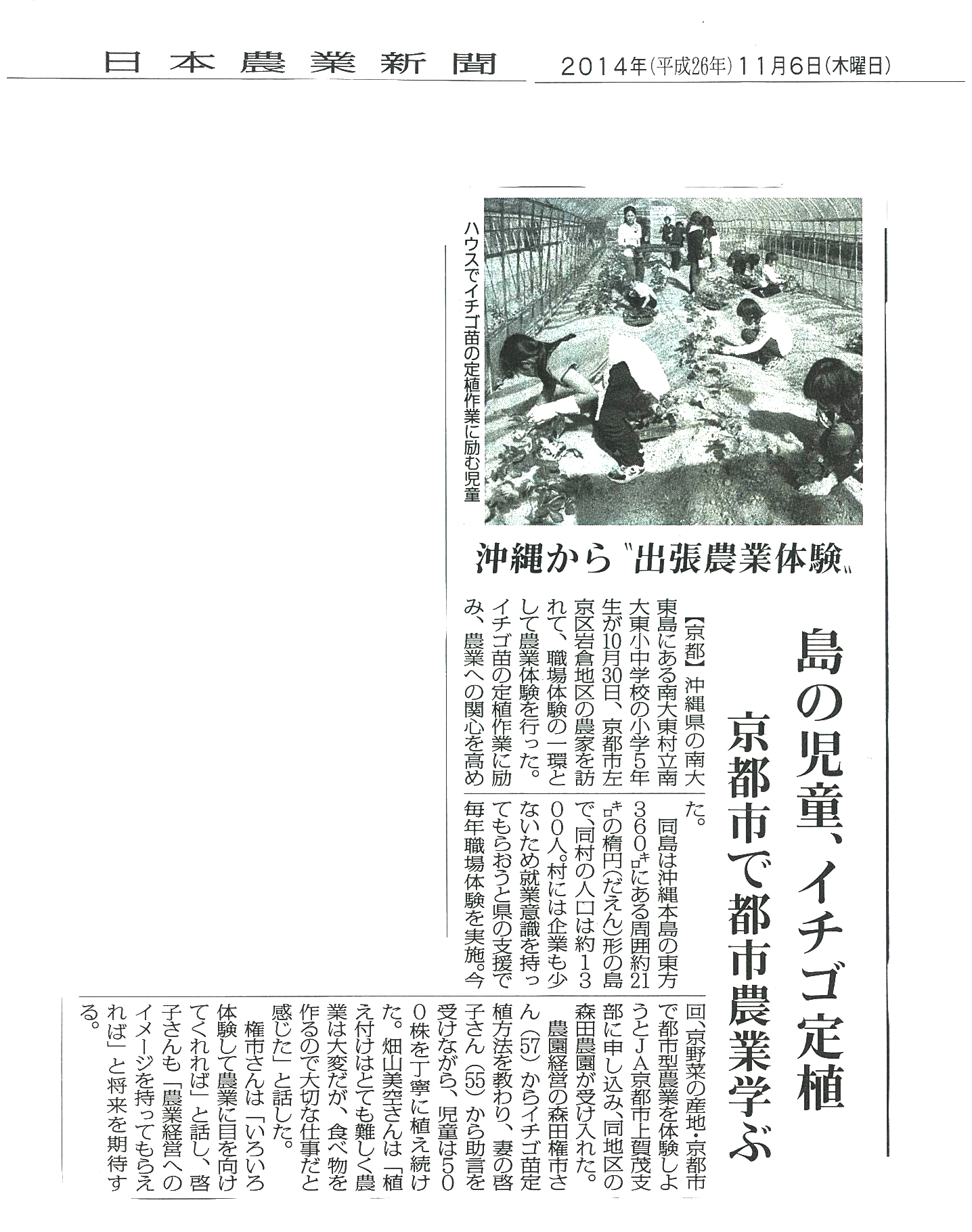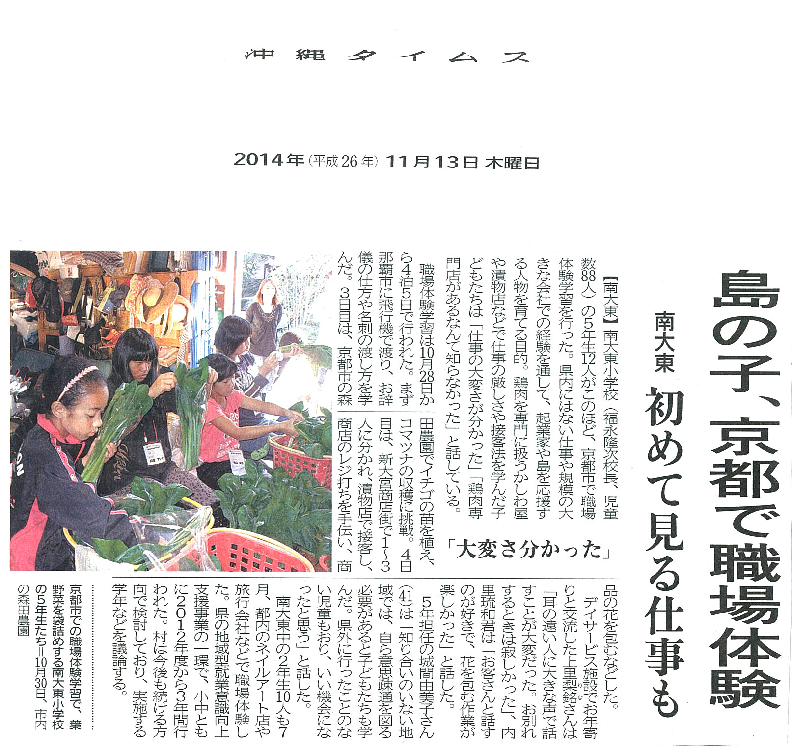 2015.04.02 【南大東村キャリア教育】南大東小5年生が京都で職場体験(京都新聞・農業新聞・沖縄タイムス) 南大東小学校の5年生たちが京都で職場体験を行いました! その時の様子を、京都新聞、農業新聞、沖縄タイムスにご紹介いただきました(*^▽^*) 日本農業新聞 京都新聞 沖縄タイムス