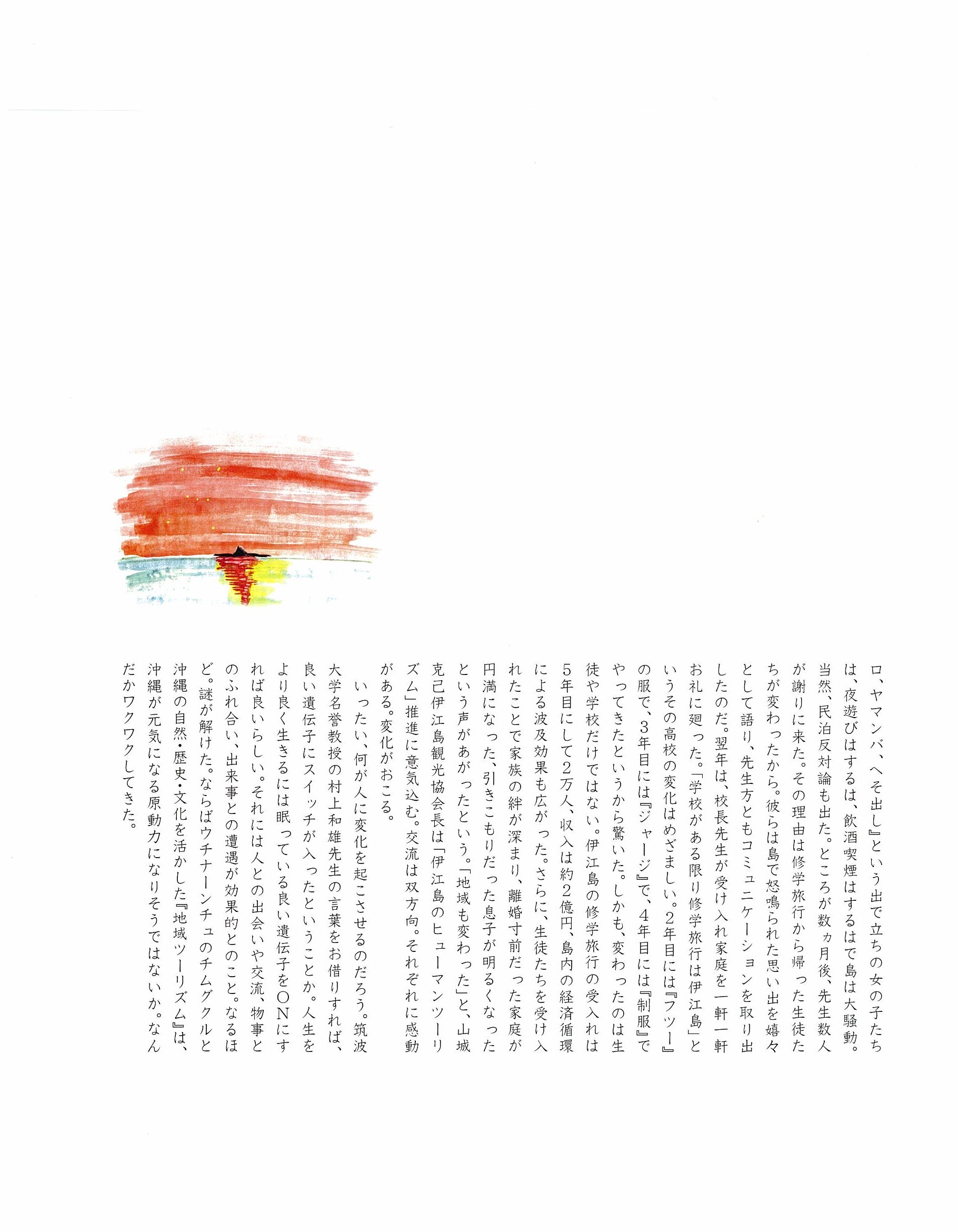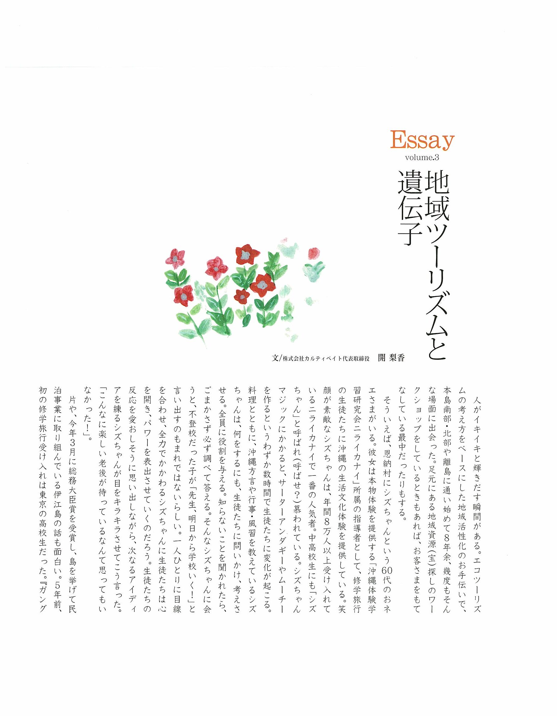 2007.12.01 沖縄タイムス『らくら』にエッセイ「地域ツーリズムと遺伝子」を寄稿 2007年12月沖縄タイムス発行の情報誌『らくら』に地域ツーリズムに関するエッセイ「地域ツーリズムと遺伝子」を寄稿しました。 『らくら』2007・2008 12・1月号 Vol.3 「地域ツーリズムと遺伝子」 (クリックして拡大) media_20071201