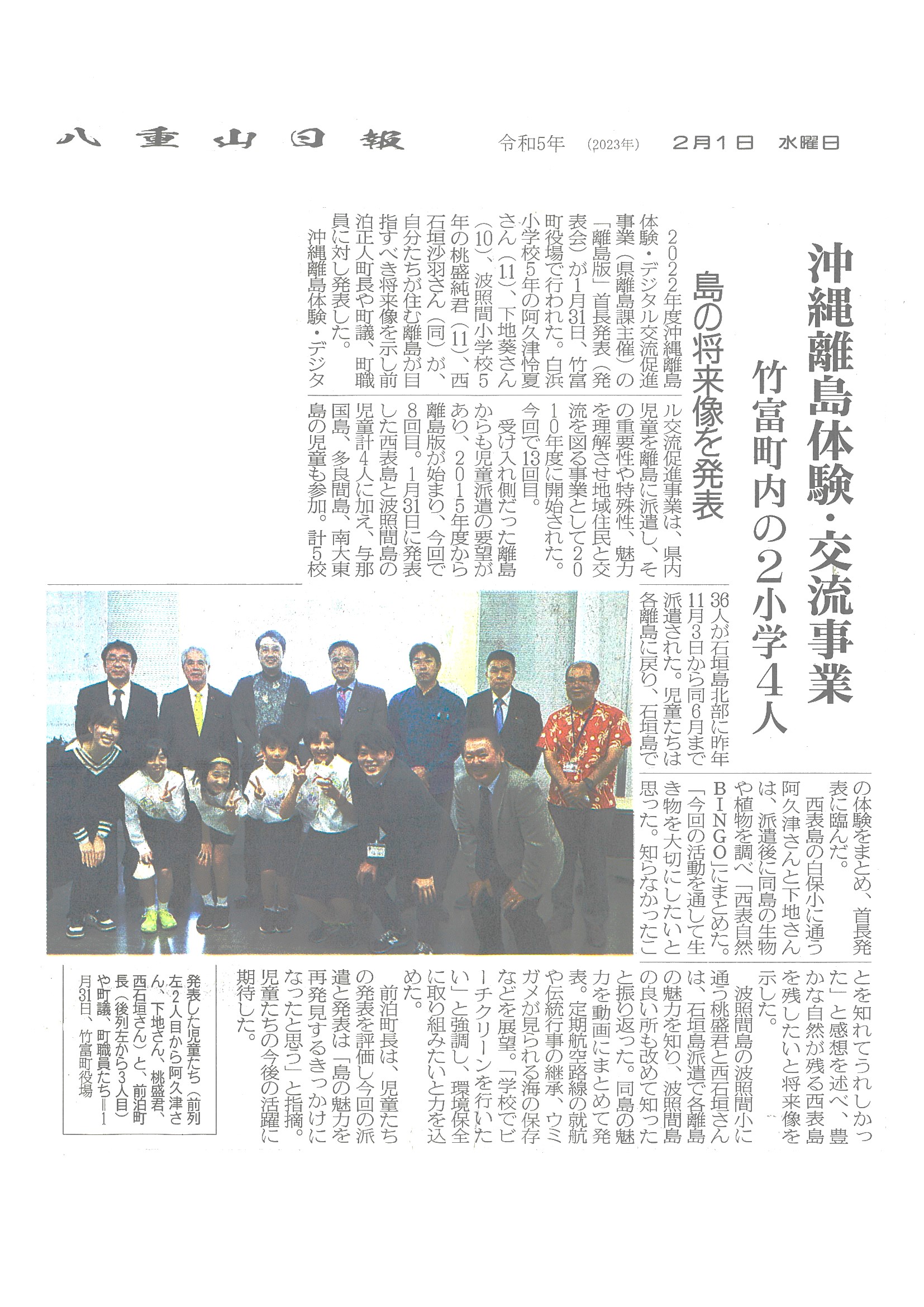 2023.02.06 八重山日報 沖縄離島体験・デジタル交流促進事業「竹富町内の2小学4人 島の将来像を発表」 2023年(令和5年)2月1日 八重山日報に掲載されました ~沖縄離島体験・交流事業~ 竹富町内の2小学4人 島の将来像を発表 ⇩下記よりご覧ください(クリックで拡大)⇩