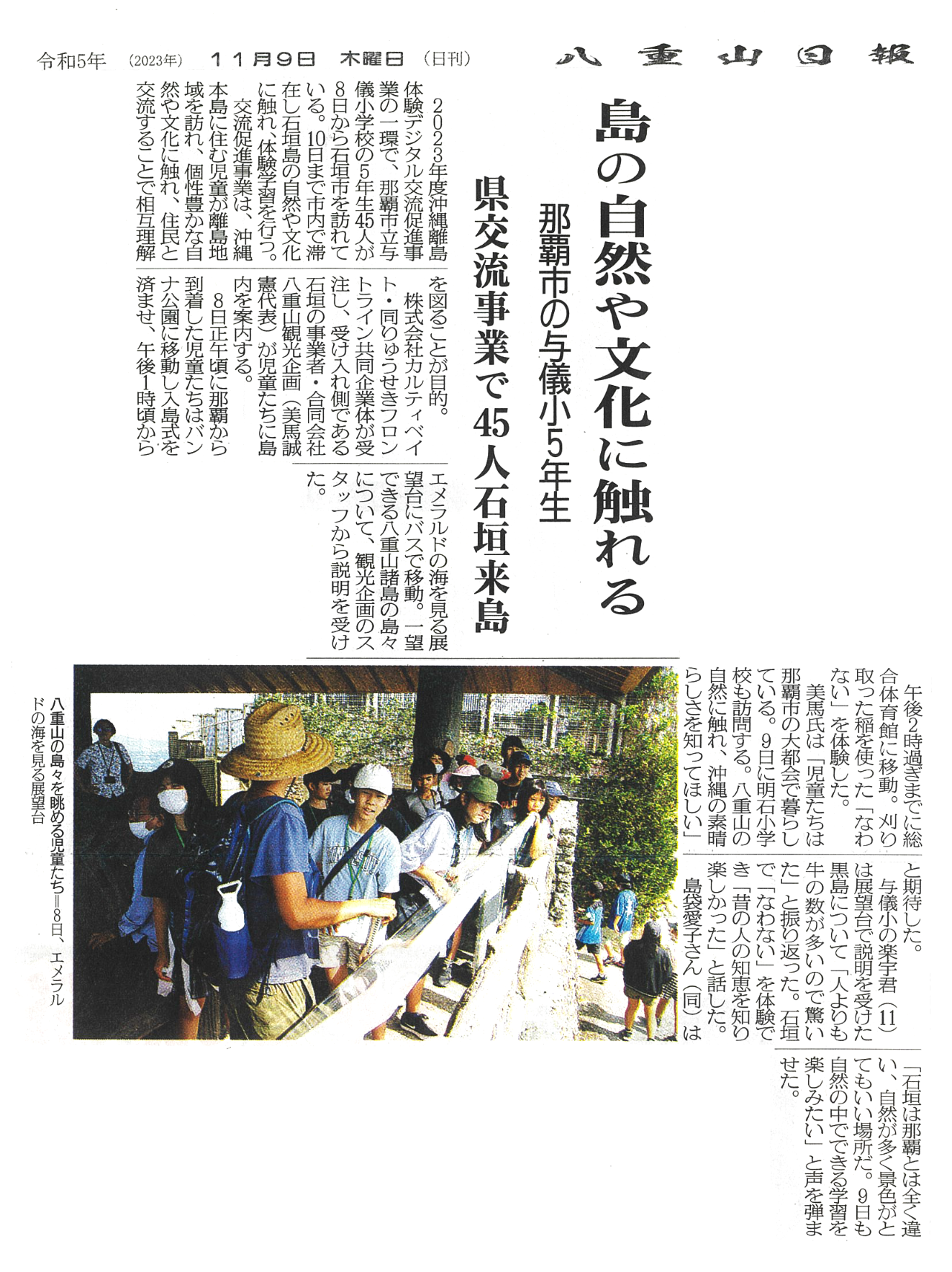 2024.04.03 八重山日報 沖縄離島体験・デジタル交流促進事業「島の自然や文化に触れる」 2023年(令和5年)11月9日 八重山日報に掲載されました ~島の自然や文化に触れる~ 那覇市の与儀小5年生 県交流事業で45人石垣来島 ⇩下記よりご覧ください(クリックで拡大)⇩