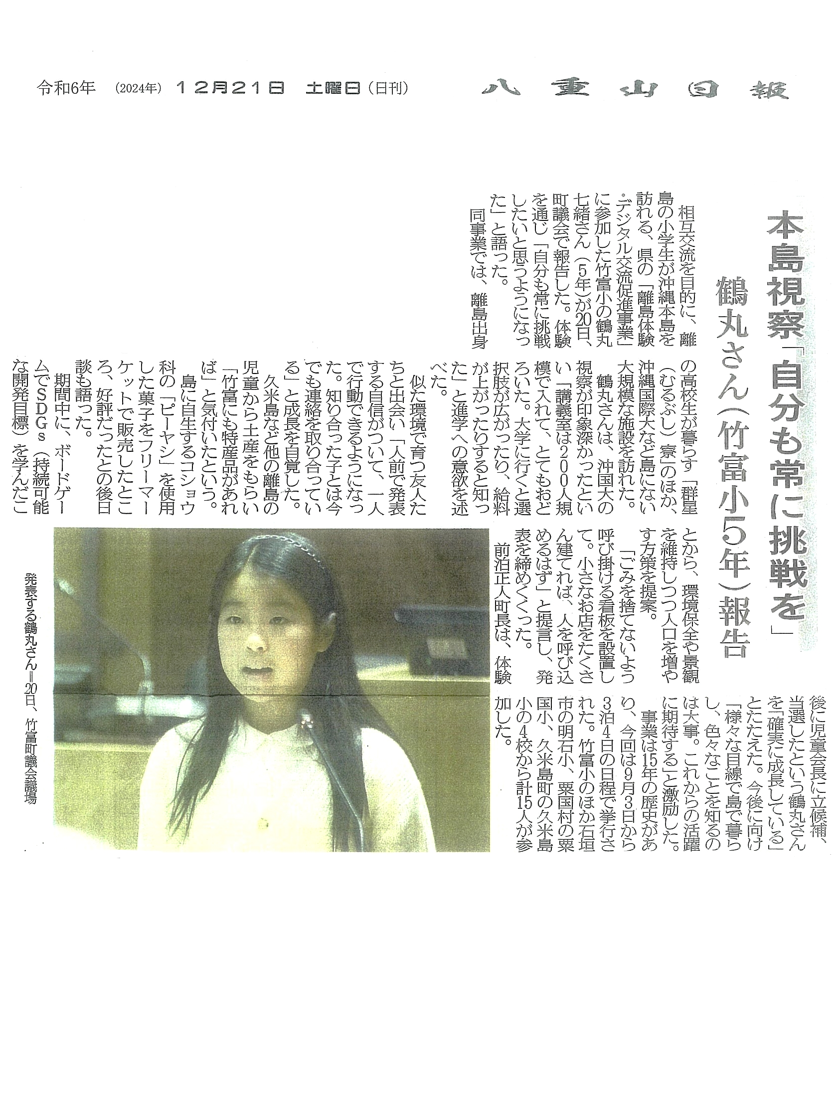 2025.01.08 八重山日報 沖縄離島体験・デジタル交流促進事業 竹富島「自分も常に挑戦を」 2024年(令和6年)12月21日 八重山日報に掲載されました ~竹富小児童が町議会で発表~ ⇩下記よりご覧ください(クリックで拡大)⇩