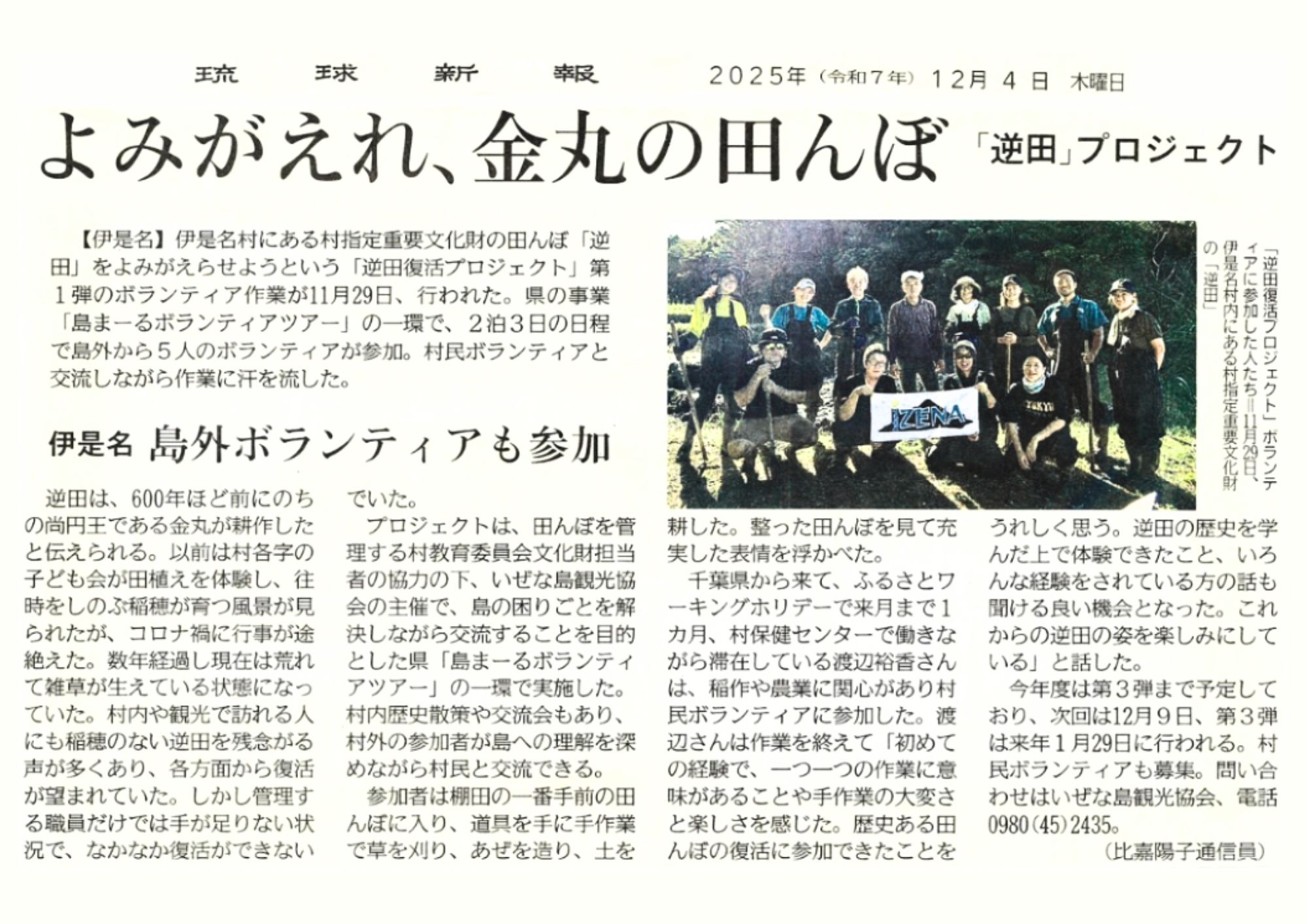 2025.12.22 琉球新報 ふるさとワーキングホリデー 伊是名島 よみがえれ、金丸の田んぼ「逆田」プロジェクト 2025年(令和7年)12月4日の琉球新報に、伊是名村の村指定重要文化財「逆田」の 復活に向けて実施された「逆田復活プロジェクト」の様子が掲載されました。 本プロジェクトには、当社が受託する「ふるさとワーキングホリデー」により 伊是名島に滞在中の参加者が参加しています。 記事詳細は↓下記よりご覧ください(クリックで拡大)