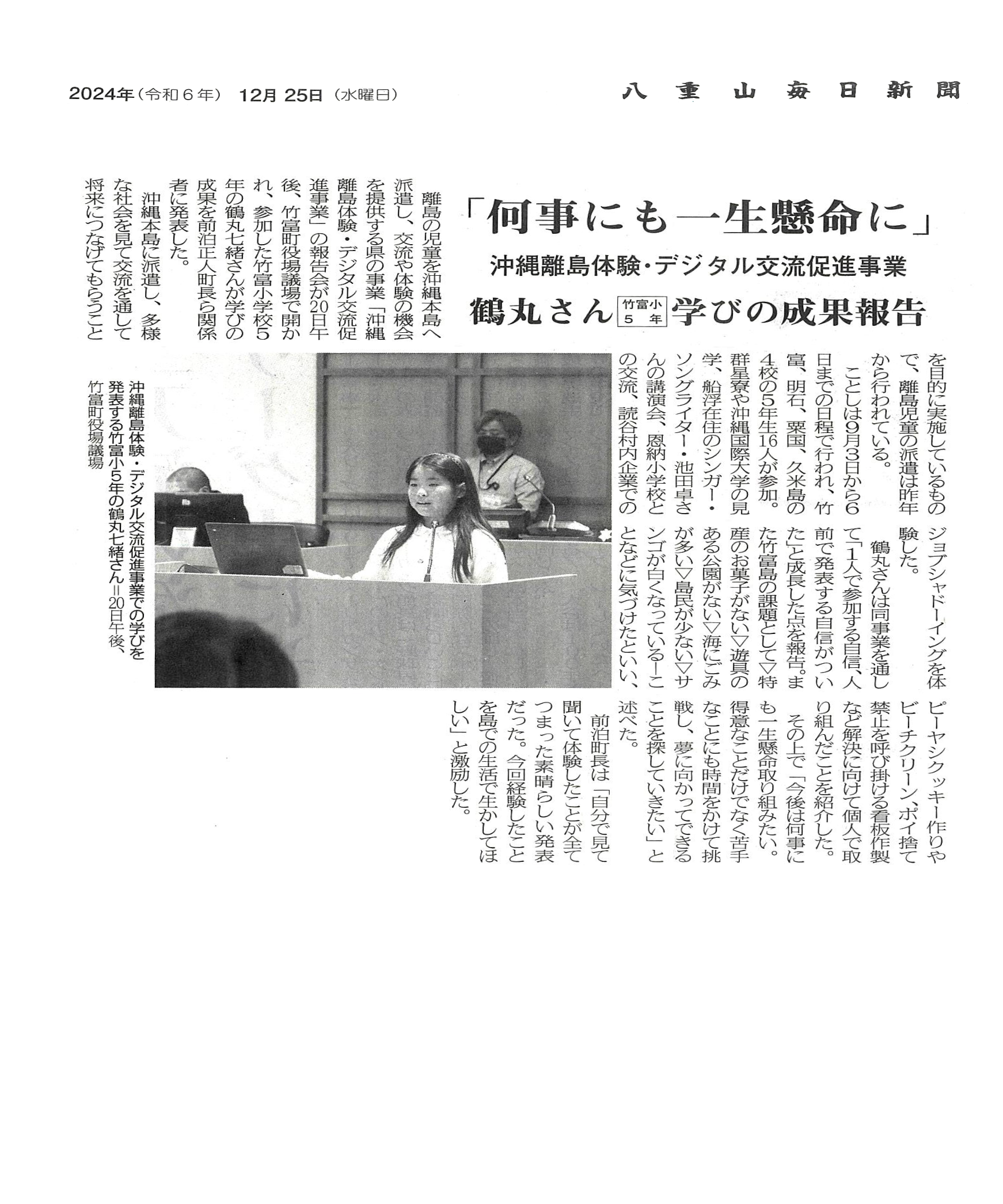 2025.01.08 八重山毎日新聞 沖縄離島体験・デジタル交流促進事業 竹富島「何事にも一生懸命に」 2024年(令和6年)12月25日 八重山毎日新聞に掲載されました ~竹富小児童が町議会で発表~ ⇩下記よりご覧ください(クリックで拡大)⇩