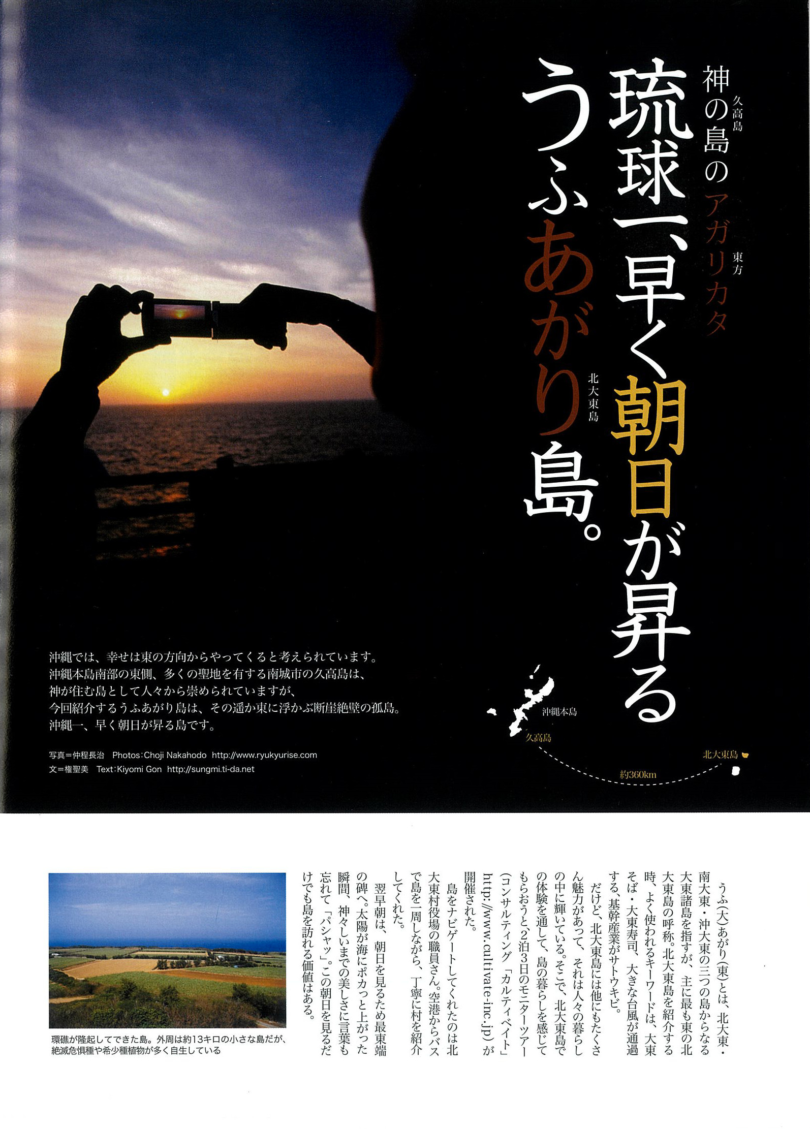 2009.04.01 『沖縄スタイル』北大東島特集「琉球一、早く朝日が昇るうふあがり島。」 2009年4月、南の島の楽園生活マガジン『沖縄スタイル』で北大東島特集「琉球一、早く朝日が昇るうふあがり島。」が掲載されました。 media_20090401