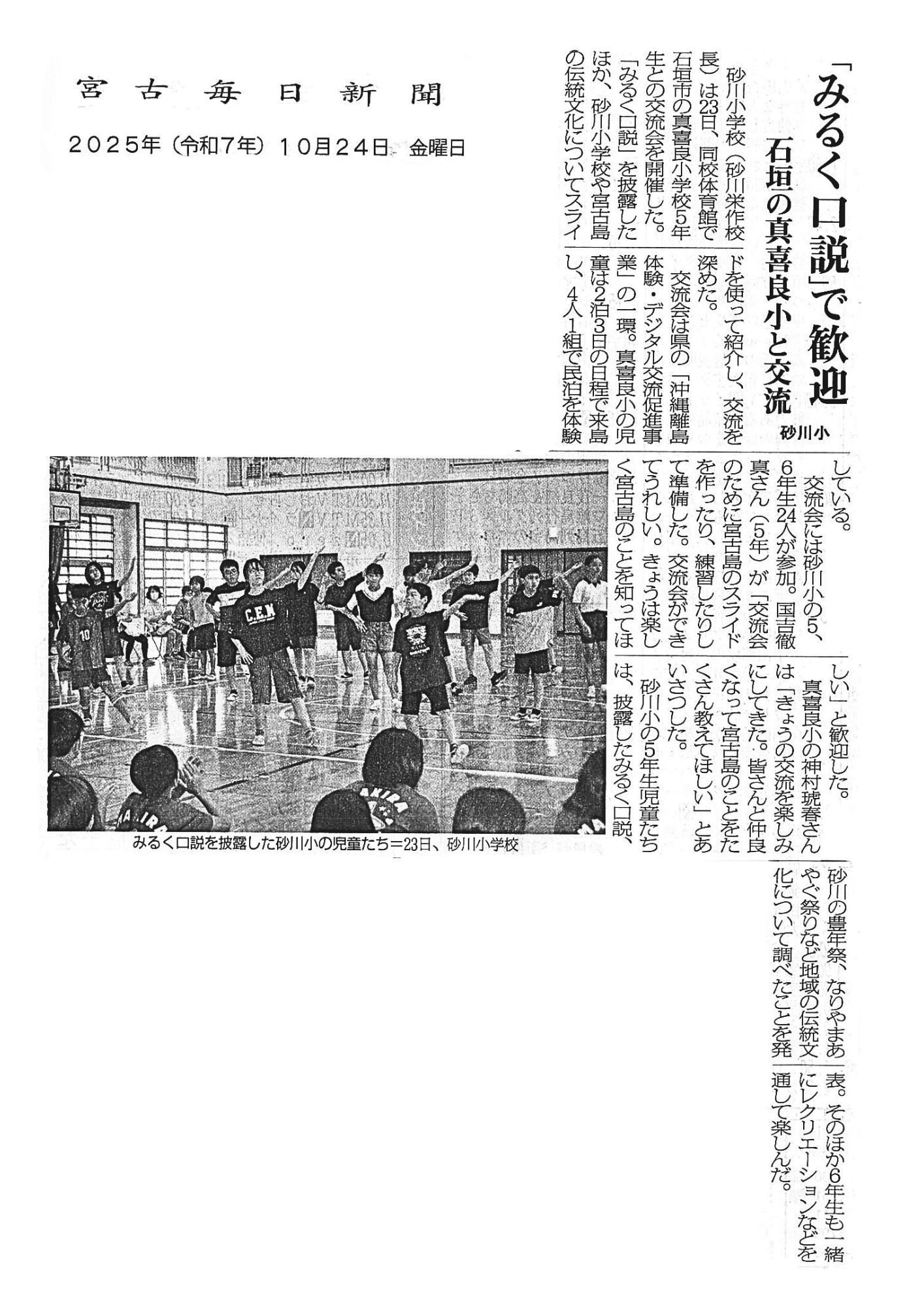 2025.10.28 宮古毎日新聞 沖縄離島体験・デジタル交流促進事業 宮古島「みるく口説で歓迎」 2025年(令和7年)10月24日 宮古毎日新聞に、宮古島で実施した本島→離島版派遣における、 石垣市立真喜良小学校と宮古島市立砂川小学校の学校交流の様子が掲載されました。 「みるく口説で歓迎」 ⇩下記よりご覧ください(クリックで拡大)⇩