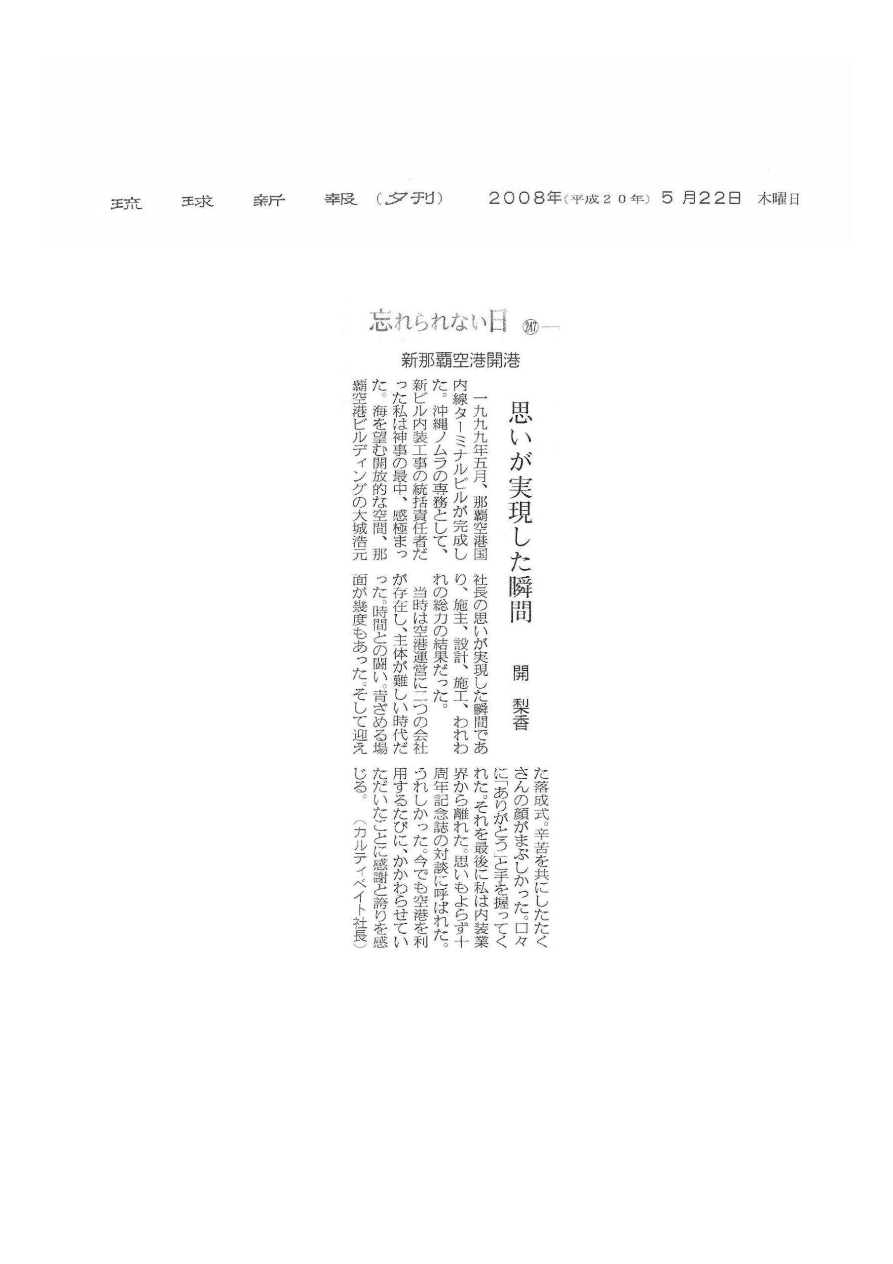 2008年5月22日琉球新報 忘れられない日「思いが実現した瞬間」が掲載されました。