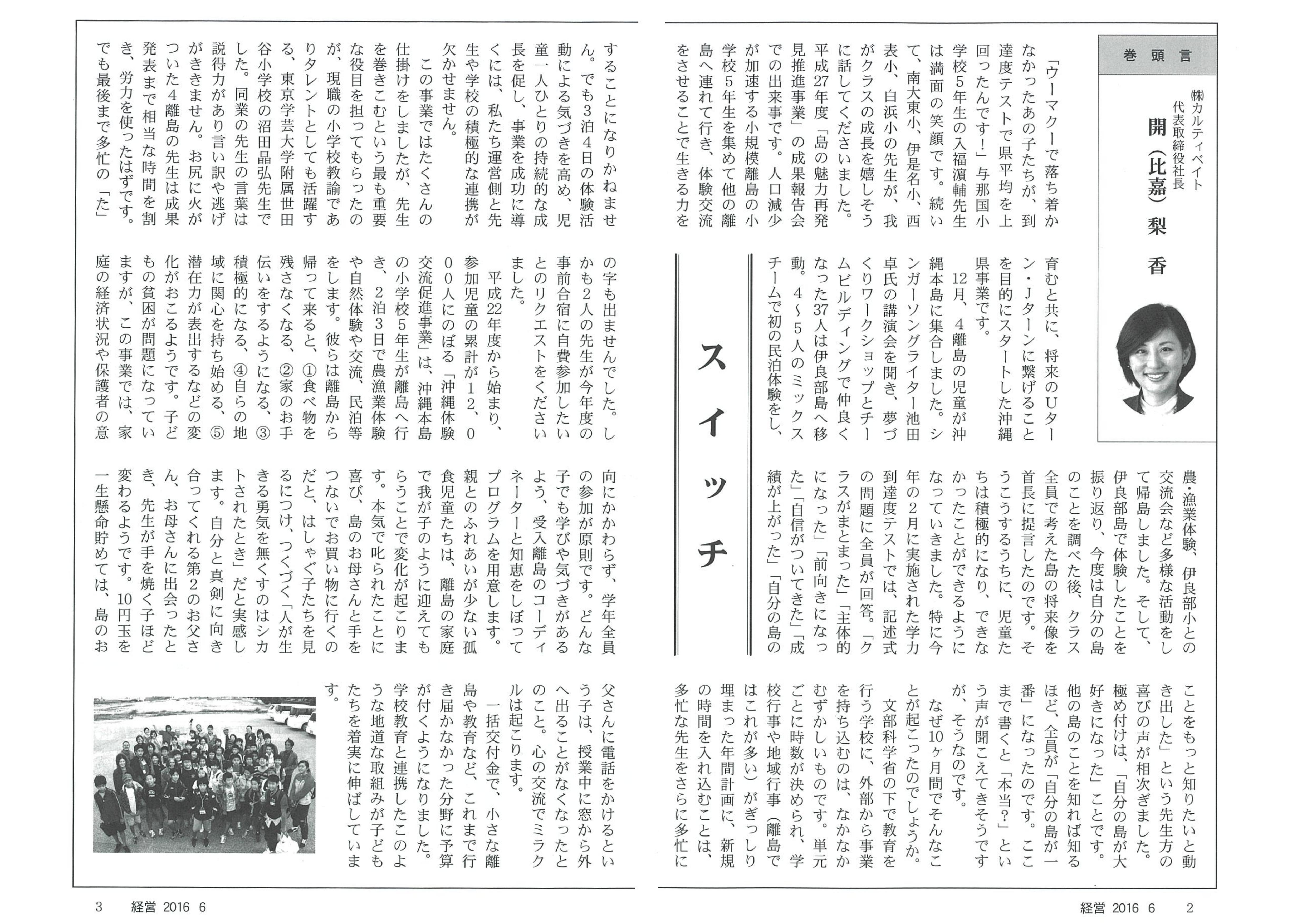 2016.06.15 月刊誌「経営」に弊社開のエッセイが掲載されました。 沖縄県経営者協会が発行している月刊誌「経営」(2016年6月15日発行)に弊社開のエッセイか掲載されました。 内容は平成27年度島の魅力再発見事業(沖縄県地域・離島課)での子ども達と先生の変化についてです。 下記からごらんください。
