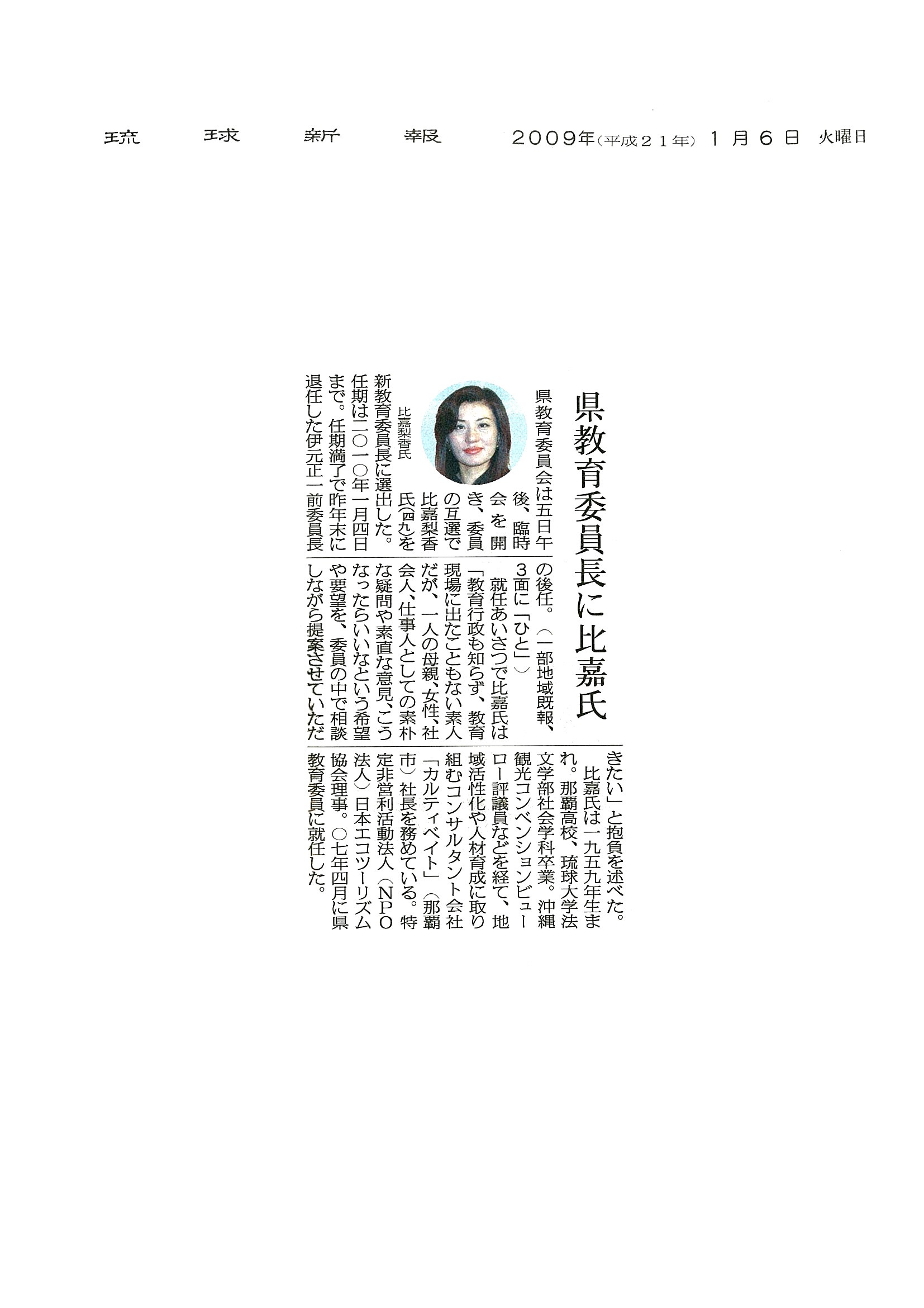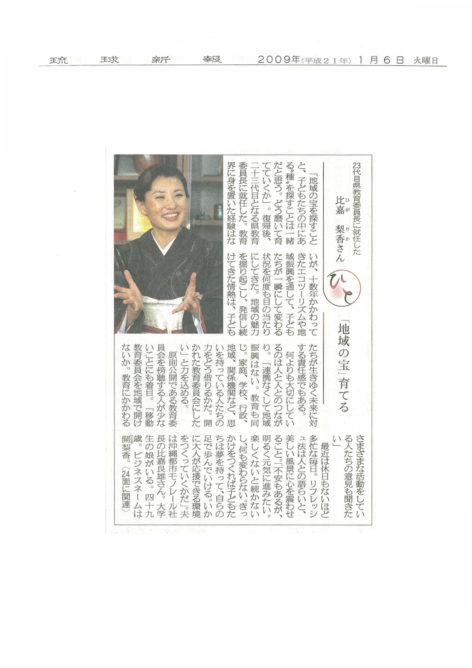 2009年1月6日琉球新報 「23代目県教育委員長に就任した比嘉梨香さん 『地域の宝』育てる」