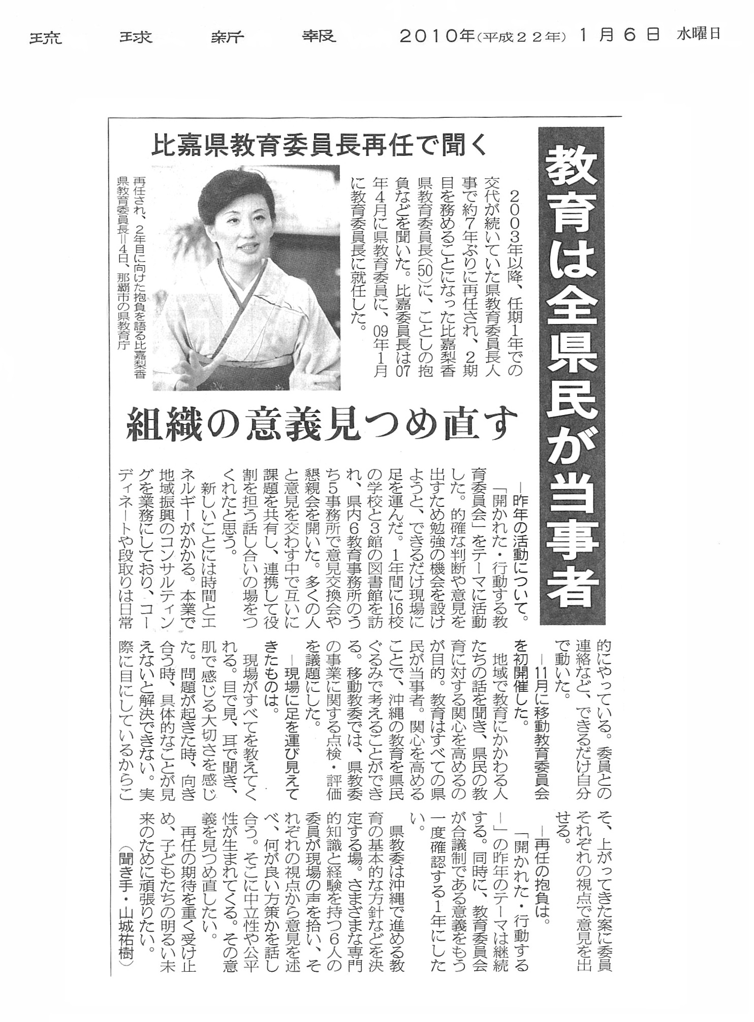 琉球新報 比嘉県教育委員長再任で聞く「組織の意義見つめ直す」