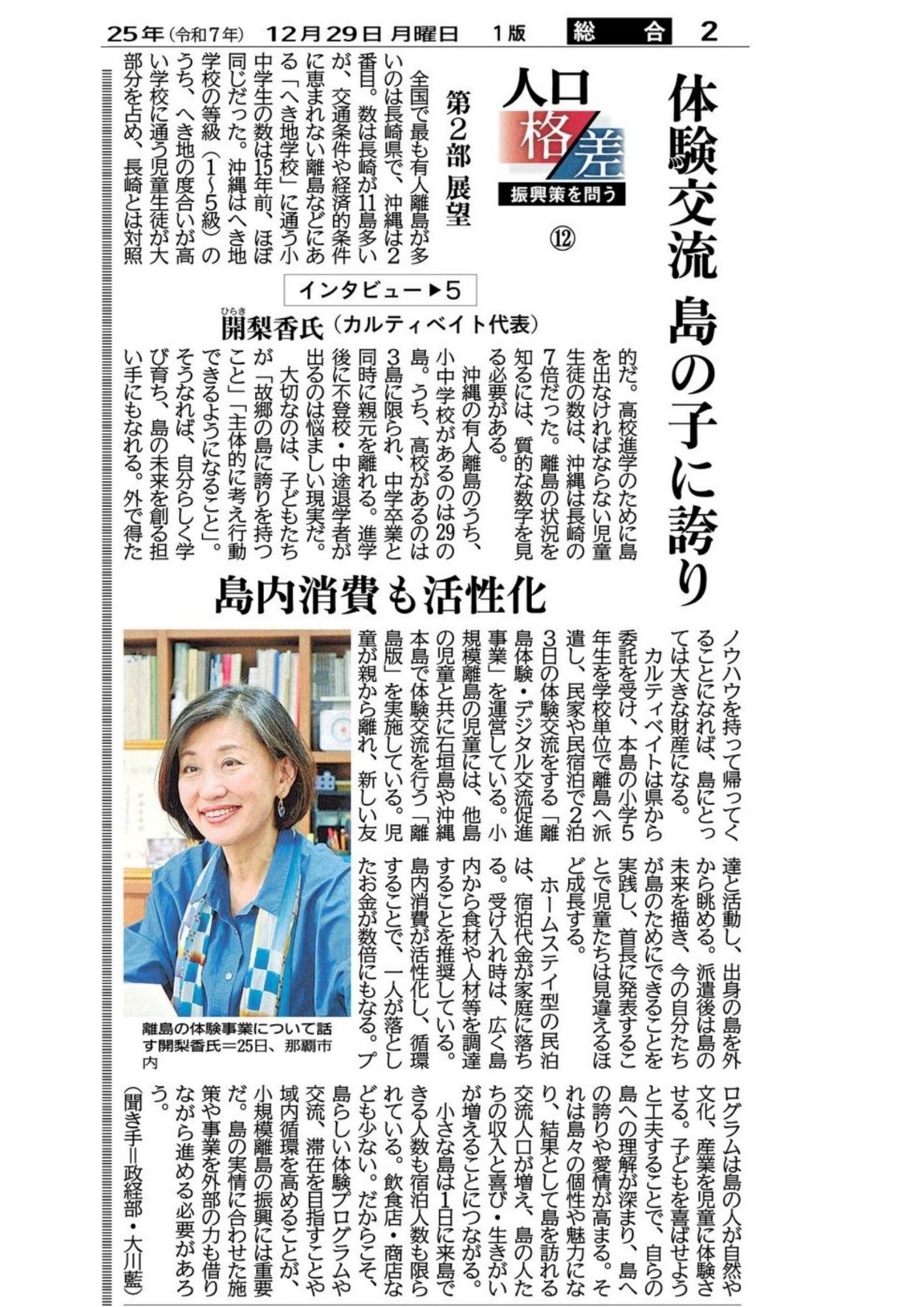 2026.03.03 沖縄タイムス 弊社代表 開 インタビュー記事「体験交流 島の子に誇り」 2025年(令和7年)12月25日 沖縄タイムスに、 弊社代表開(比嘉)のインタビュー記事が掲載されました。 ⇩下記よりご覧ください(クリックで拡大)⇩ 「体験交流 島の子に誇り」
