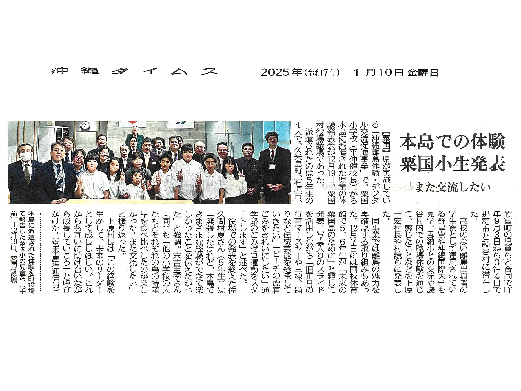 2025.01.10 沖縄タイムス 沖縄離島体験・デジタル交流促進事業「本島での体験 粟国小生発表」 2025年(令和7年)1月10日 沖縄タイムスに掲載されました ~また交流したい~ 粟国小児童が村議会で発表 ⇩下記よりご覧ください(クリックで拡大)⇩