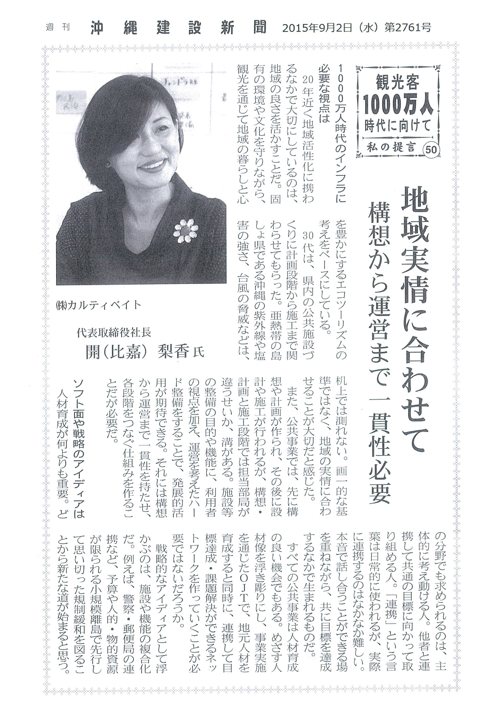 20150902 観光客1000万人時代に向けて[沖縄建設新聞]
