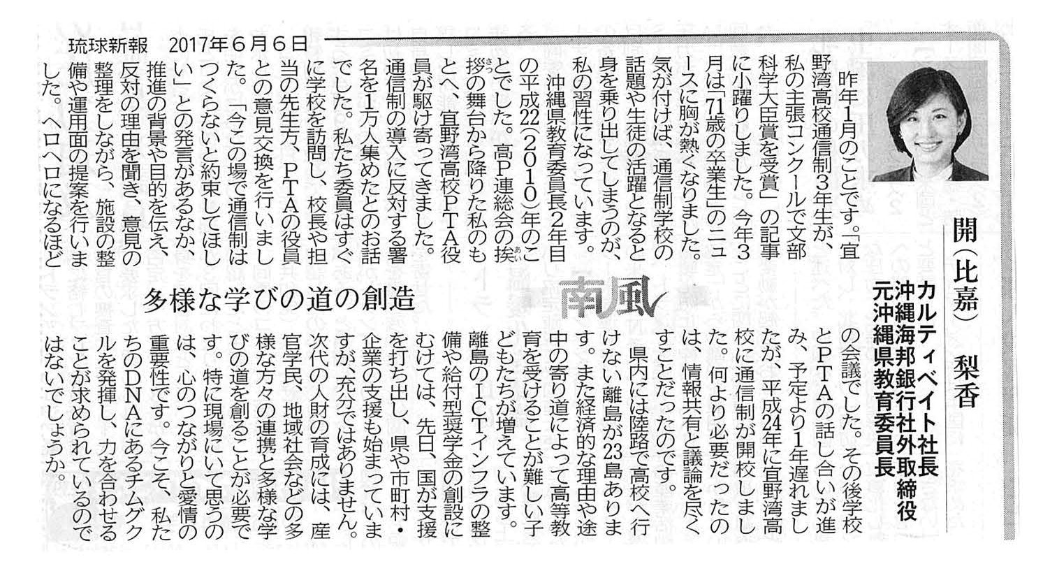 2017年6月6日 「南風」12回目の開のコラムが琉球新報に掲載されました。