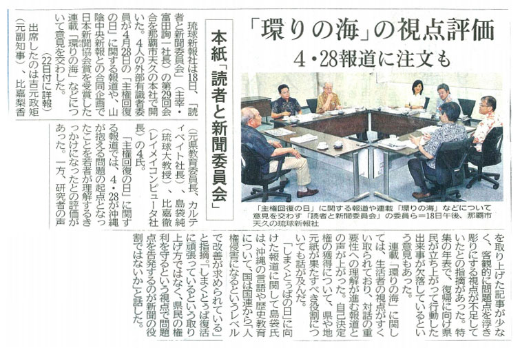 琉球新報「読者と新聞委員会」の速報が掲載されました