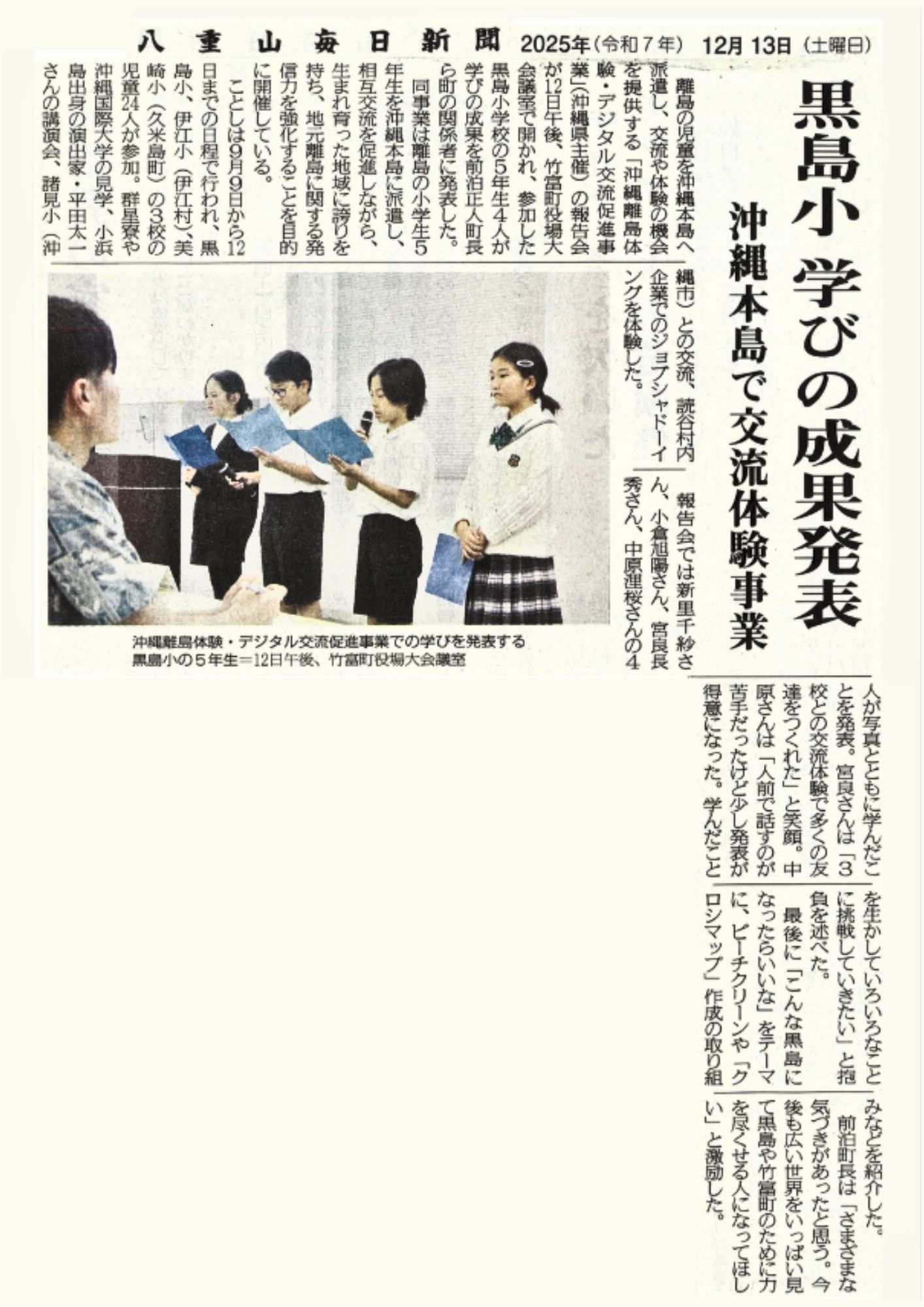 2025.12.22 八重山毎日新聞 沖縄離島体験・デジタル交流促進事業 竹富町 「黒島小学校 学びの成果発表」 2025年(令和7年)12月13日 八重山毎日新聞に、 「沖縄離島体験・デジタル交流促進事業(離島→本島版)」の派遣を終えた 黒島小学校による、首長発表の様子が掲載されました。 「黒島小 学びの成果発表 沖縄本島で交流体験事業」 ⇩下記よりご覧ください(クリックで拡大)⇩