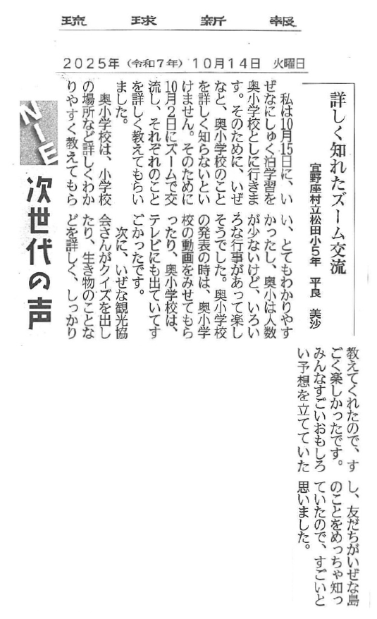 2025.10.16 琉球新報 沖縄離島体験・デジタル交流促進事業 伊是名島「詳しく知れたズーム交流」 2025年(令和7年)10月14日 琉球新報に、伊是名島・奥小学校とオンライン離島体験を実施した 宜野座村立松田小学校 児童の感想が掲載されました。 「詳しく知れたズーム交流」 ⇩下記よりご覧ください(クリックで拡大)⇩
