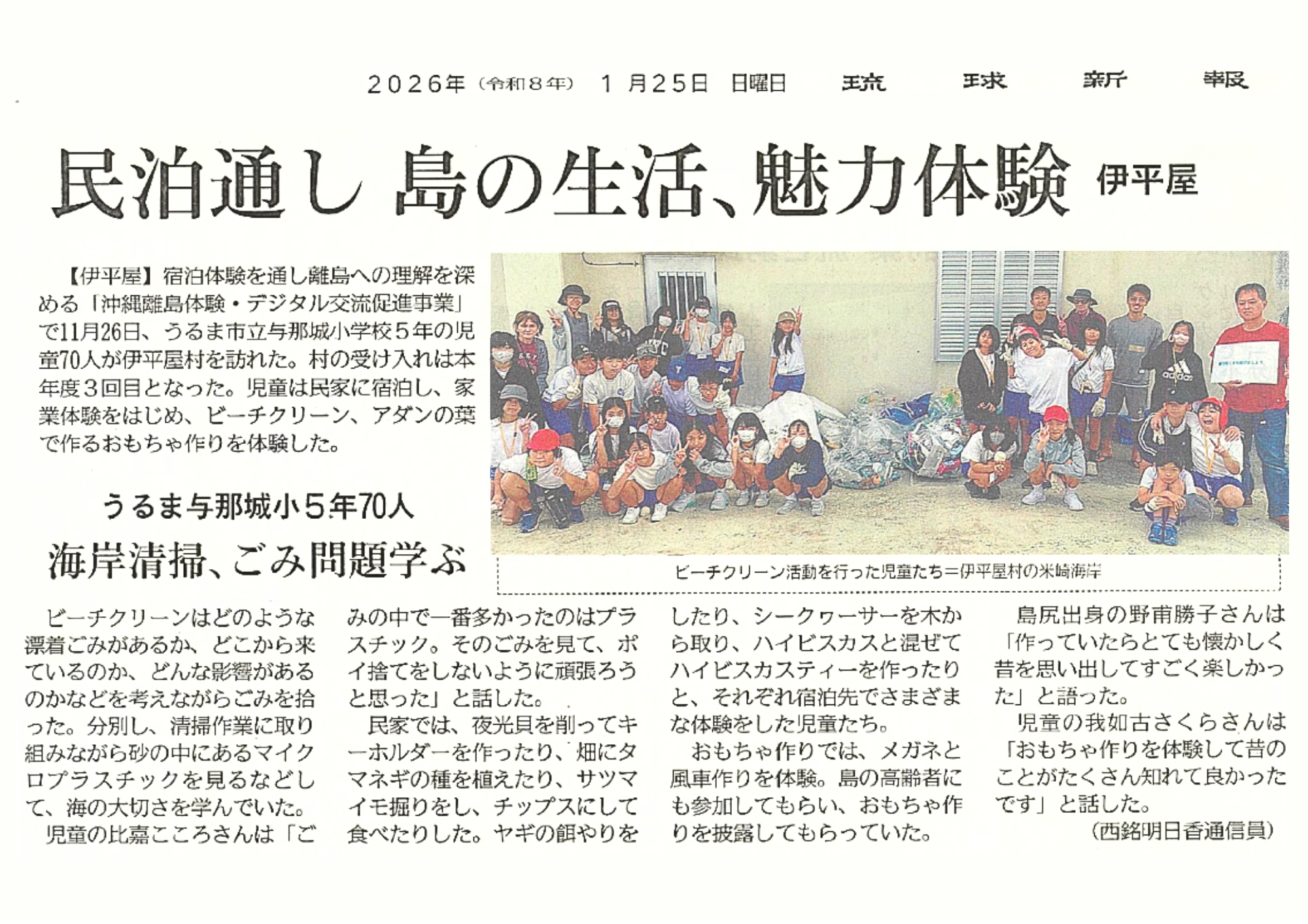 2026.03.03 琉球新報 沖縄離島体験・デジタル交流促進事業 伊平屋島「民泊通し 島の生活、魅力体験」 2026年(令和7年)1月25日 琉球新報に、伊平屋島にて離島体験を終えた うるま市立与那城小学校の派遣時の様子が掲載されました。 「民泊通し 島の生活、魅力体験」 ⇩下記よりご覧ください(クリックで拡大)⇩