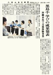 2025.12.22 八重山毎日新聞沖縄離島体験・デジタル交流促進事業 竹富町 「黒島小学校 学びの成果発表」 2025年(令和7年)12月13日 八重山毎日新聞に、 「沖縄離島体験・デジタル交流促進事業(離島→本島版)」の派遣を終えた 黒島小学校による、首長発表の様子が掲載されました。 「黒島小 学びの成果発表 沖縄本島で交流体験事業」 ⇩下記よりご覧ください(クリックで拡大)⇩