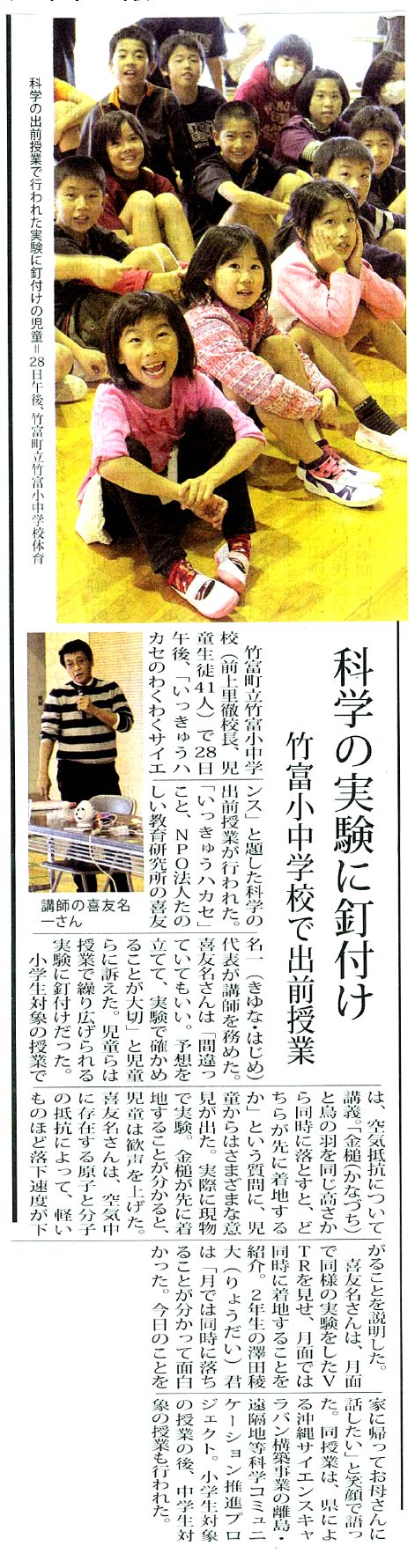 喜友名さんは、月面で同様の実験をしたVTRを店、月面では同時に着地することを紹介。2年生の澤田稜大(りょうだい)君は「月では同時に落ちることが分かって面白かった。今日のことを家に帰ってお母さんに話したい」と笑顔で語った。同授業は、県による沖縄サイエンスキャラバン構築事業の離島・遠隔地等コミュニケーション推進プロジェクト。小学生対象の授業の後、中学絵師対象の授業も行われた。