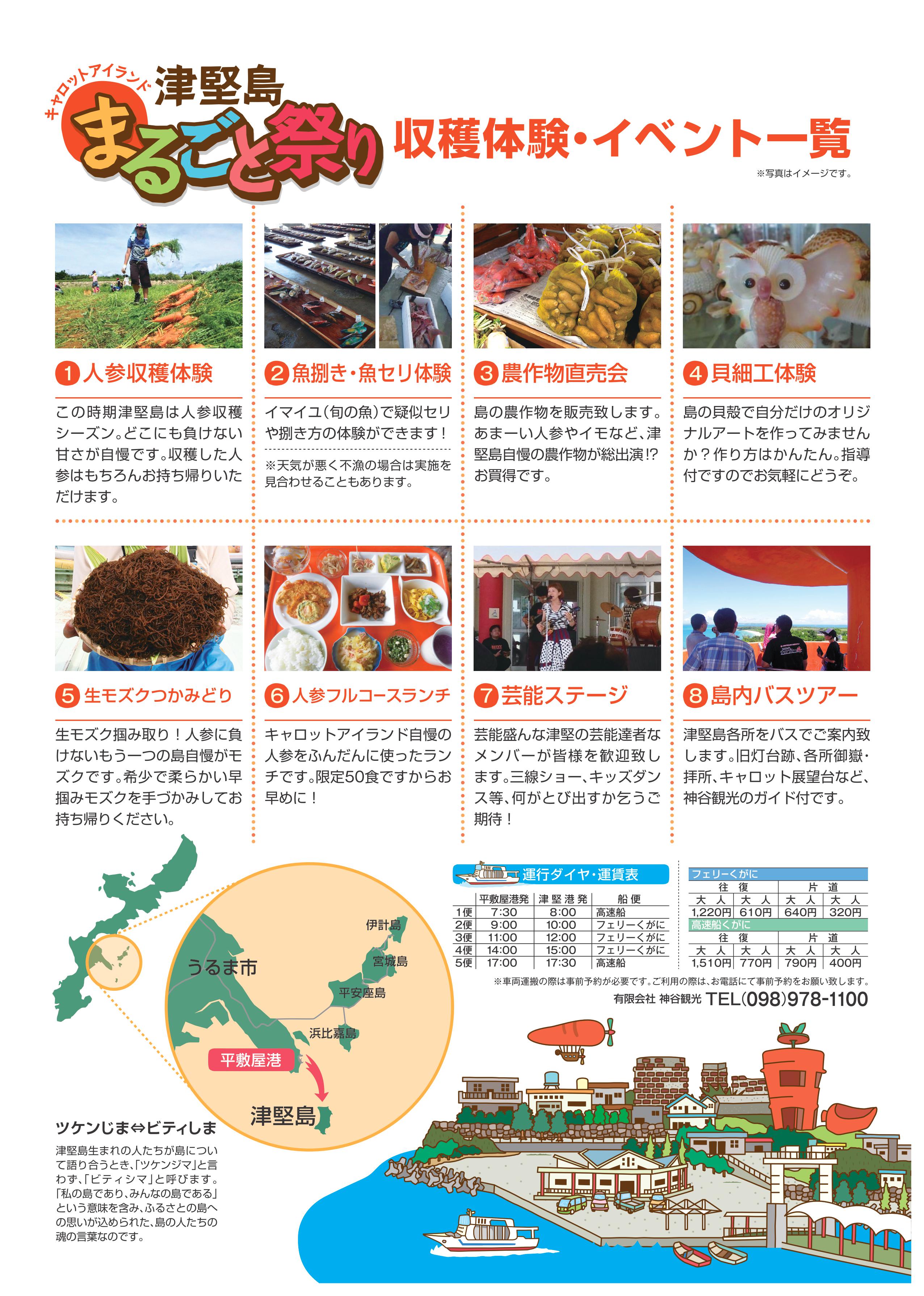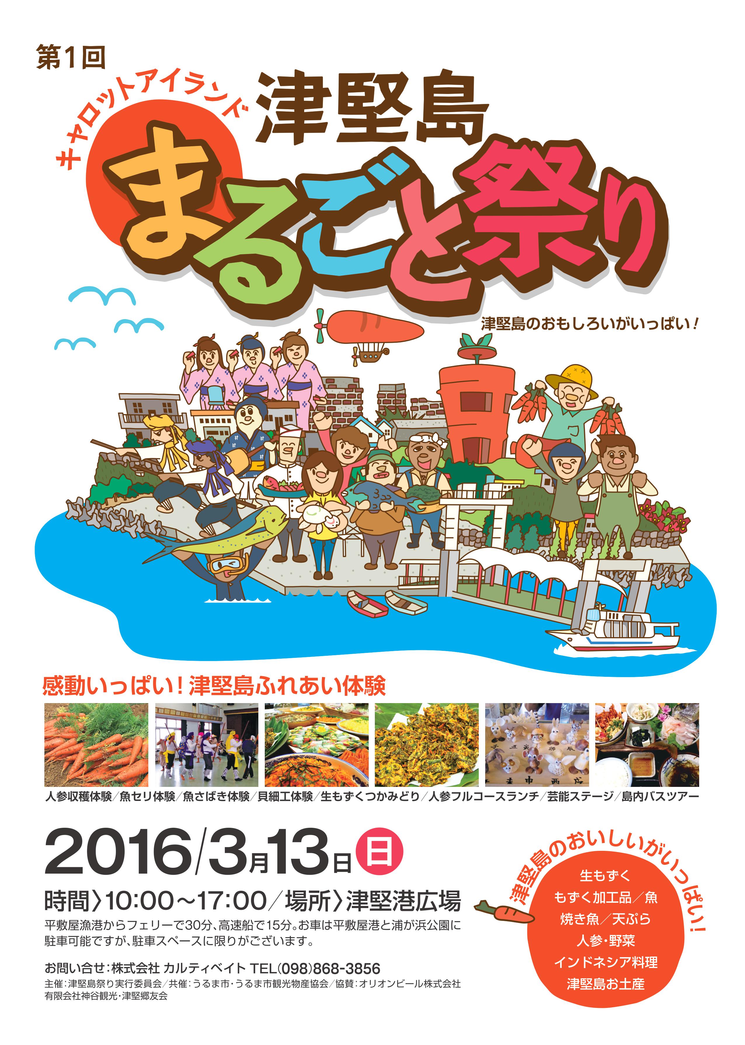 2016.02.08 「まるごと津堅島祭り」3月13日に開催決定! 弊社がうるま市から委託を受け、地域活性化のお手伝いをさせていただいている 津堅島で、初めての手作り祭り「まるごと津堅島祭り」を開催する事が決まりました! 平成24年度から行っている、うるま市「津堅島」島おこし支援事業の集大成! どんなお祭りになるのか乞うご期待!