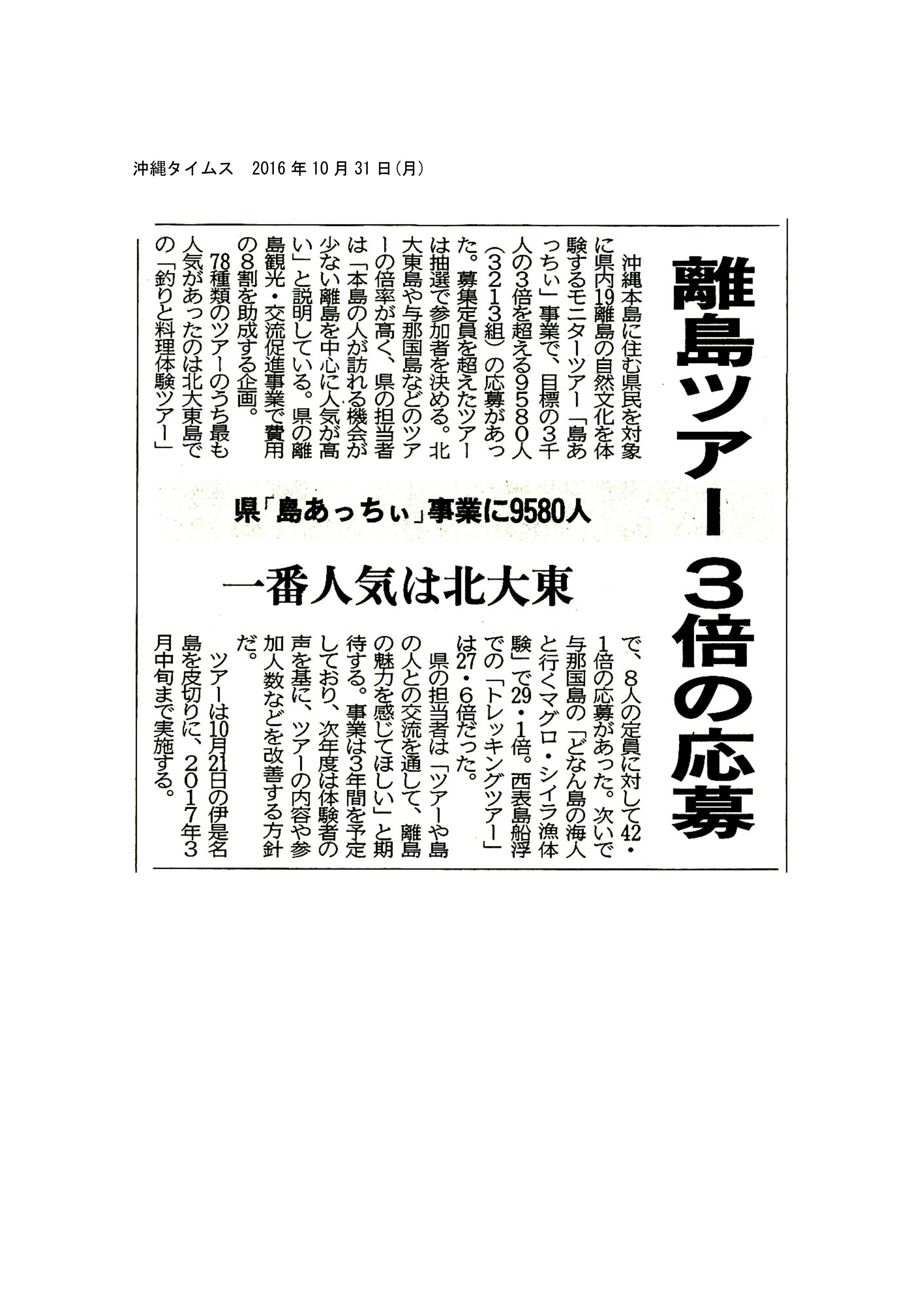 20161031【島あっちぃ】離島ツアー3倍の応募[沖縄タイムス]