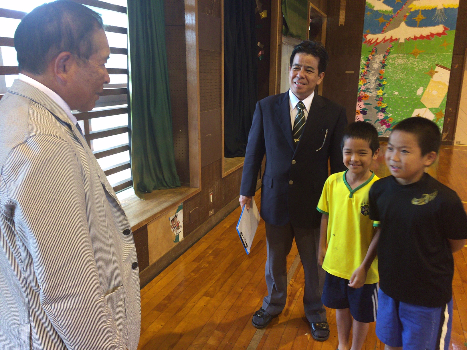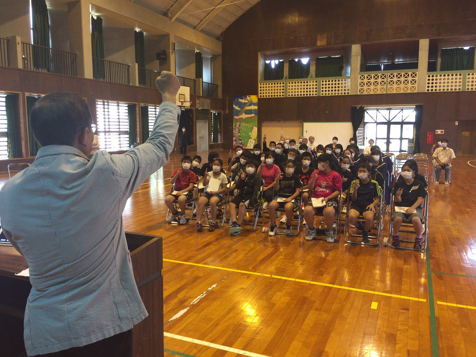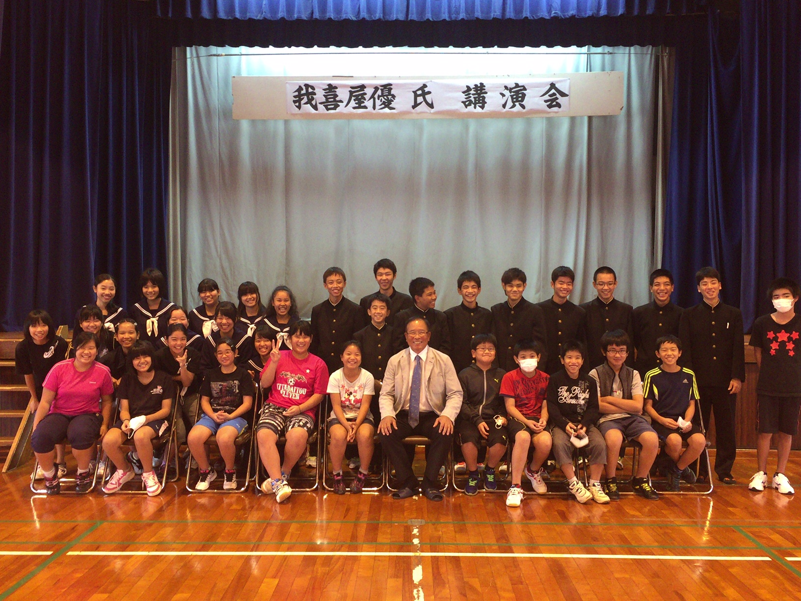 2016.12.06 興南学園我喜屋監督の講演会@北大東島 北大東村キャリア教育事業の一環で興南高校我喜屋監督の講演会を実施してきました。 「魂・知・和」「第六感を鍛える」「小さな事をしっかりやる」など、今後夢に向かって行くためのヒントがたくさん詰まった講演会でした。 対象学年ではない児童も憧れの我喜屋監督を見ようと、休み時間ギリギリまで体育館玄関から話しを聞いていました。