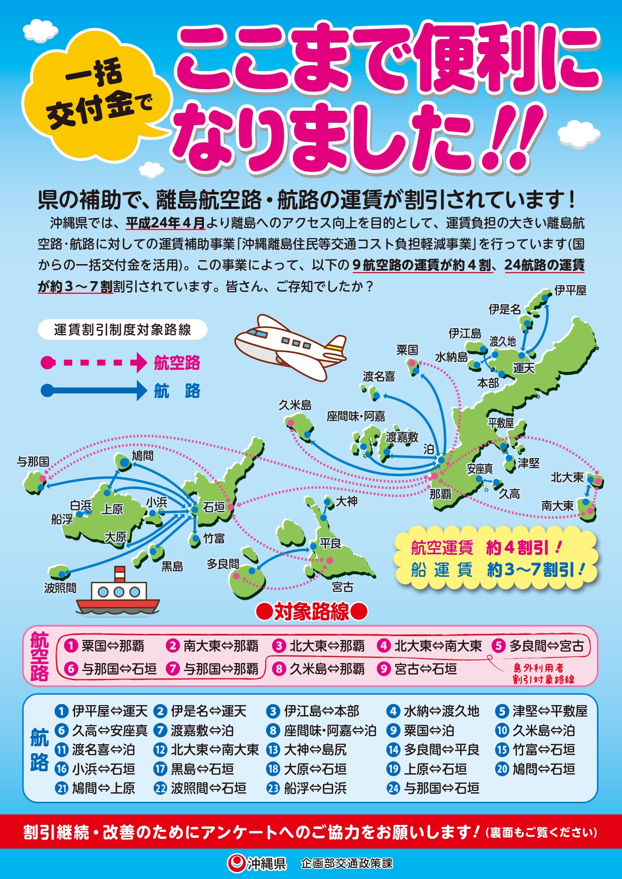 2019.10.26 【交通コスト】令和元年度事業の受託が決定しました 沖縄離島住民等交通コスト負担軽減事業による経済波及効果等調査業務の受託が決定致しました。 今回の事業では、島の方々の交通コストを軽減することでどんな経済波及効果があったのかを明らかにしていきます。 次期沖縄振興計画の策定にも関わる、離島にとって重要な事業なのでがんばります! 下はH26年度の事業で使ったチラシです。