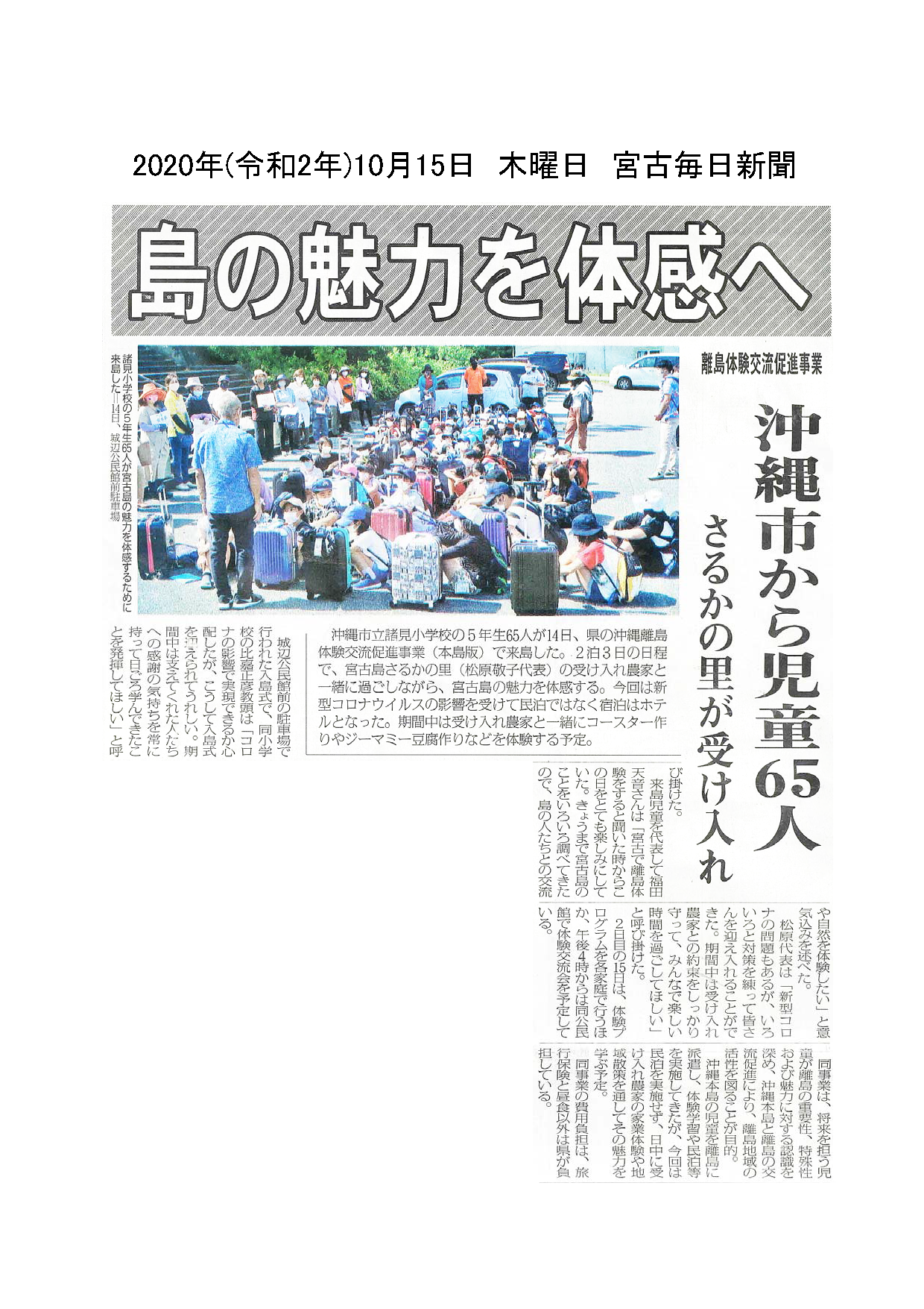 2020.10.14 今年度離島体験初の受入 宮古島 新型コロナウイルスの影響で延期になっていた今年度の離島体験交流促進事業が、10月14日~16日の2泊3日の日程で沖縄市立諸見小学校5年生65人が宮古島を訪れました。 受入れる島側も訪れる学校もそれぞれが真剣に覚悟と責任をもって取り組み、体験学習を通して自分の地域と島との違いを学びました。 実施終了後も体調を崩す生徒や先生・スタッフもおらず、大成功でした。