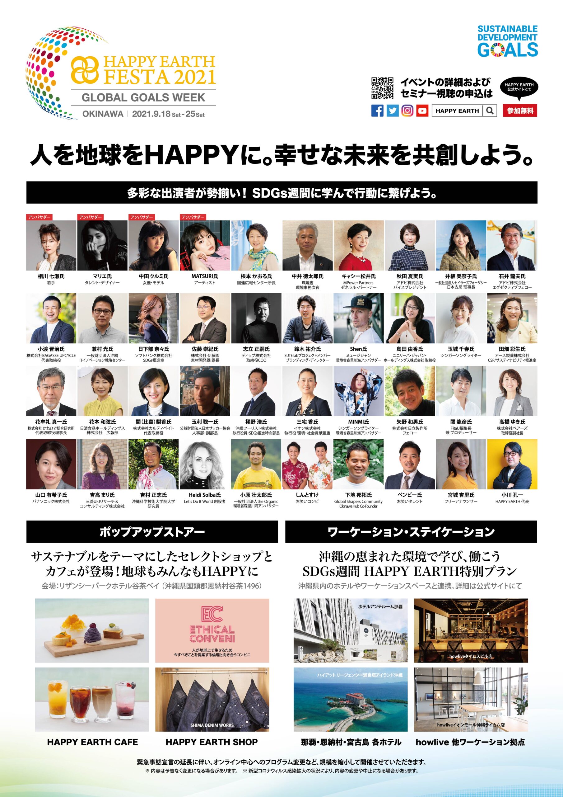 2021.09.20 【SDGs週間】HAPPY EARTH FESTA 2021が開催中です! 弊社代表の開が顧問を務めるイベント『HAPPY EARTH FESTA 2021』が、25日まで開催中です! SDGsの推進と達成に向けて、60名を越える多彩な出演者による23種のプログラムをオンライン配信予定です。 人や地球の未来のための小さな一歩として、ぜひ奮ってご参加ください。 (事前の視聴予約が必要なものもあります) https://happyearth.jp/event/hef2021/program/seminar/#0918