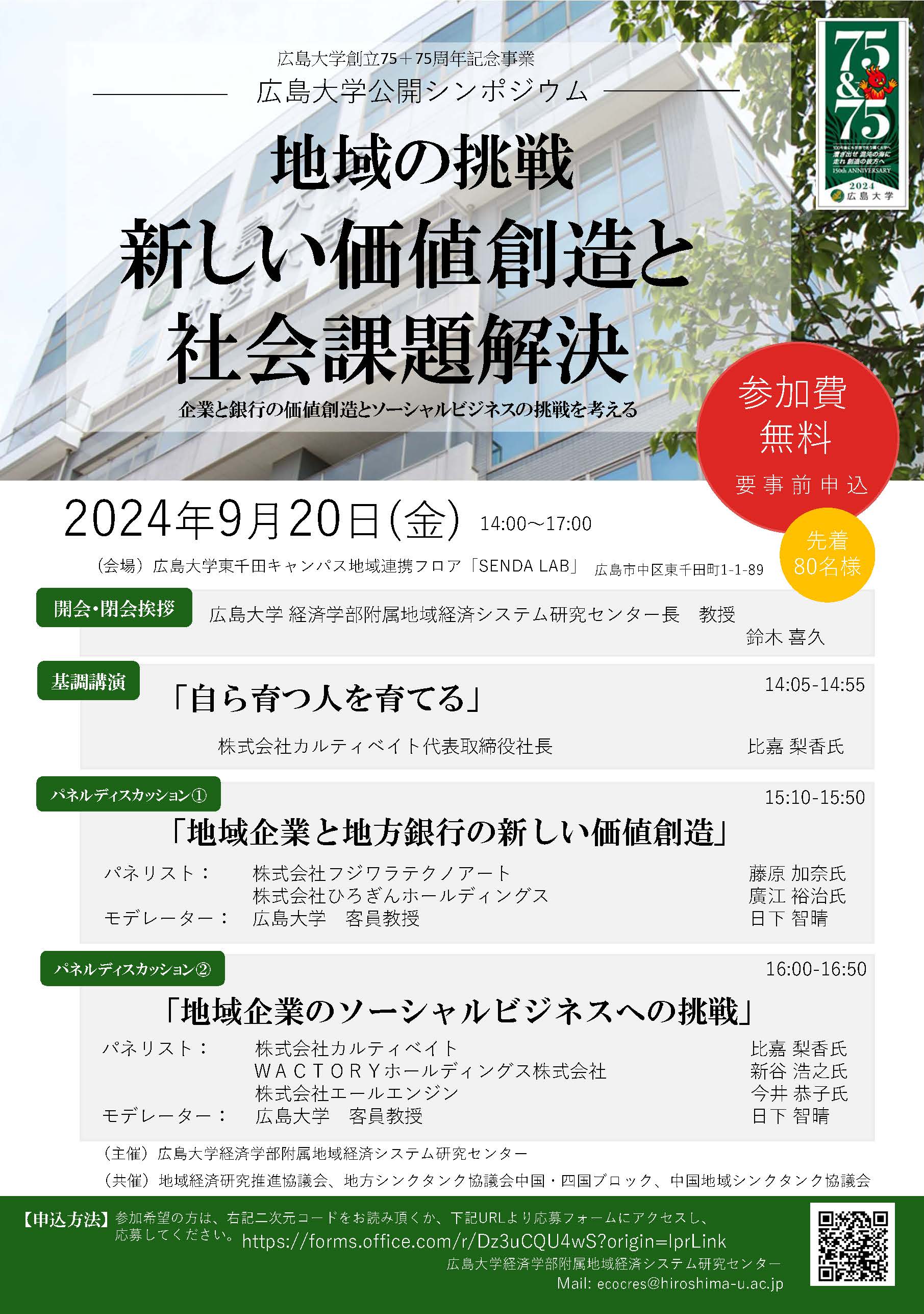 2024.07.16 弊社代表開(比嘉) 広島大学公開シンポジウムセミナー基調講演に登壇 2024年9月20日(金) 14:00~17:00 広島大学公開シンポジウムセミナーの基調講演に弊社代表比嘉梨香が講師として登壇いたします 基調講演 14:05~14:50『自ら育つ人を育てる』 講師:株式会社カルティベイト代表取締役社長 比嘉 梨香