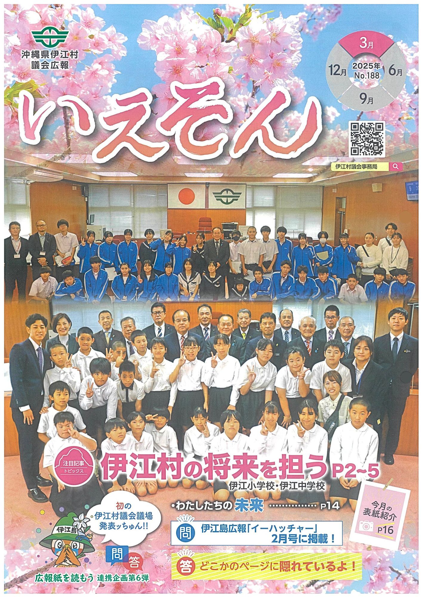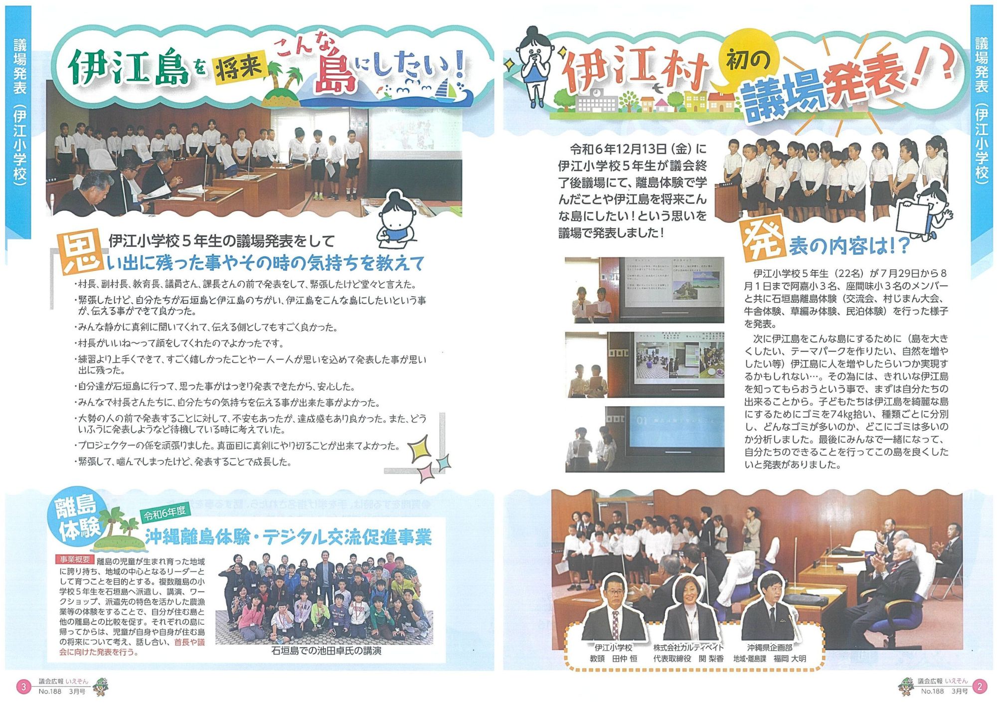2025.11.11 令和6年 沖縄離島体験・デジタル交流促進事業 伊江小学校 5年生22名 伊江村議会議場にて発表 令和7年3月発行の伊江村議会広報「いえそん」において、 伊江小学校5年生22名が伊江村議会議場で発表を行う様子が掲載されました。 発表では、石垣島で実施した「令和6年 沖縄離島体験・デジタル交流促進事業(離島→本島版)」での学びをもとに、児童達が伊江島の将来について考え、自分たちにできることを発表しました。 ⇩下記よりご覧ください(クリックで拡大)⇩