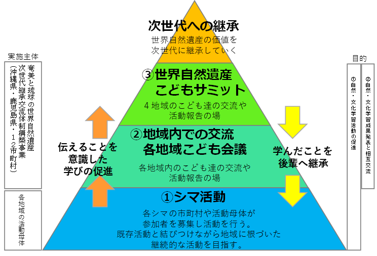 ●沖縄県は沖縄島北部及び西表島を世界自然遺産登録候補地として、鹿児島県の奄美大島・徳之島とともに登録を目指している。当該登録に向けて、また登録後においても、沖縄県と鹿児島県は、奄美大島、徳之島、沖縄島北部及び西表島(以下4地域)の顕著で普遍的な価値を有する自然地域を、全人類のための資産として保護・保全し、次世代へと引き継いでいくことが重要である。また、こども達が世界自然遺産の推薦地(※登録後は登録地。以下同じ。)の住人であることに誇りをもつためには、幼い頃から地域の環境教育や体験活動を通して、自分たちの自然環境とその価値を理解し、それを分かち合える人々と共に、その知識と経験を発揮する場(発表会、ディスカッション、高等教育課程等)を持続的に提供することが必要と考える。